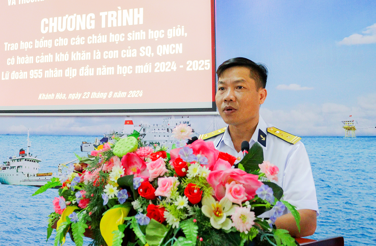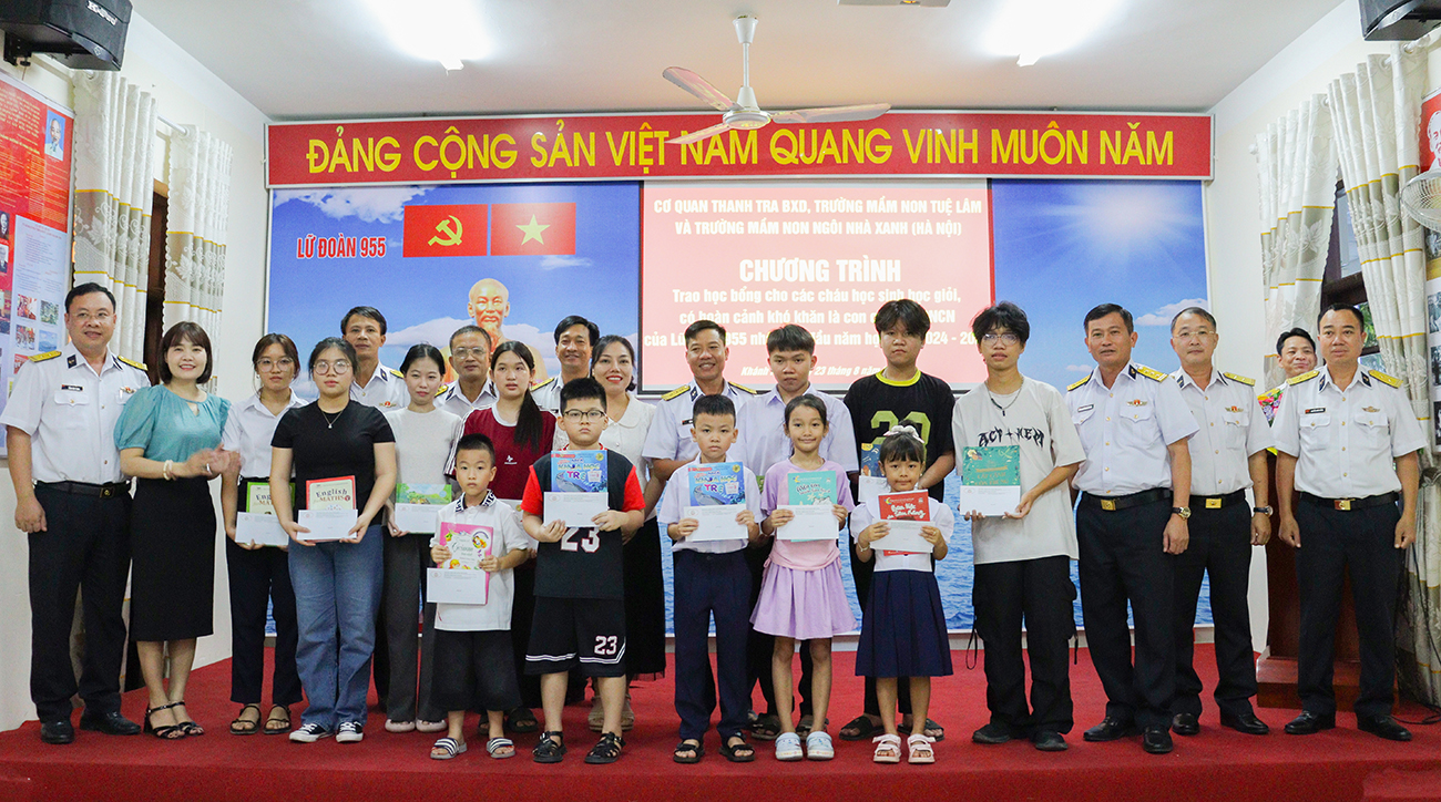 Chiều 23/8, tại TP. Cam Ranh, tỉnh Khánh Hòa, Lữ đoàn 955, Vùng 4 Hải quân phối hợp với đại diện Cơ quan Thanh tra Bộ Xây dựng; Trường Mầm non Ngôi Nhà Xanh và Trường Mầm non song ngữ Tuệ Lâm (TP. Hà Nội) tổ chức trao học bổng cho con của sĩ quan, QNCN nhân dịp chuẩn bị bước vào năm học mới 2024-2025.