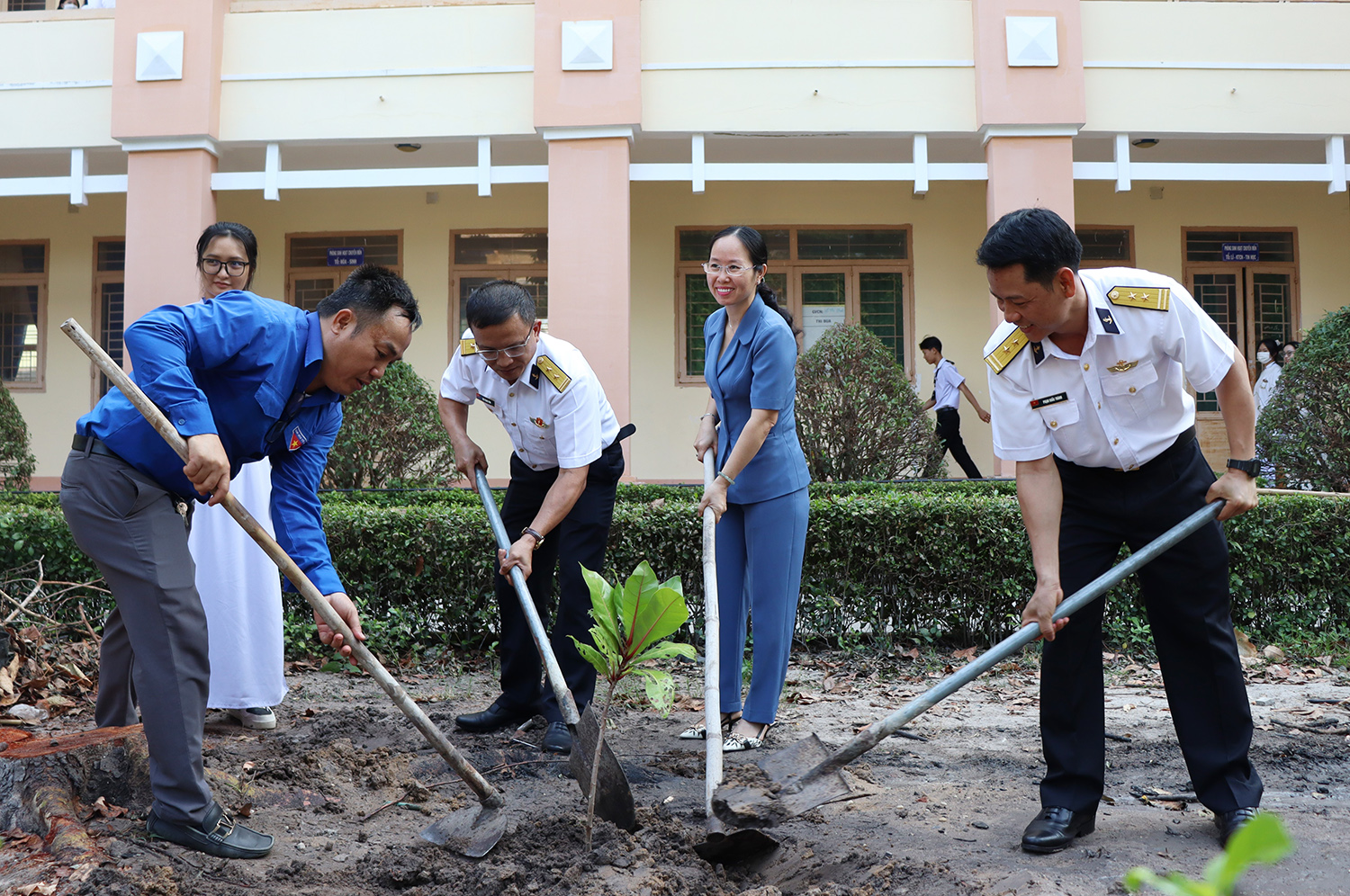 Đại diện Lữ đoàn 955 trồng cây bàng quả vuông tại trường PTTH Chơn Thành