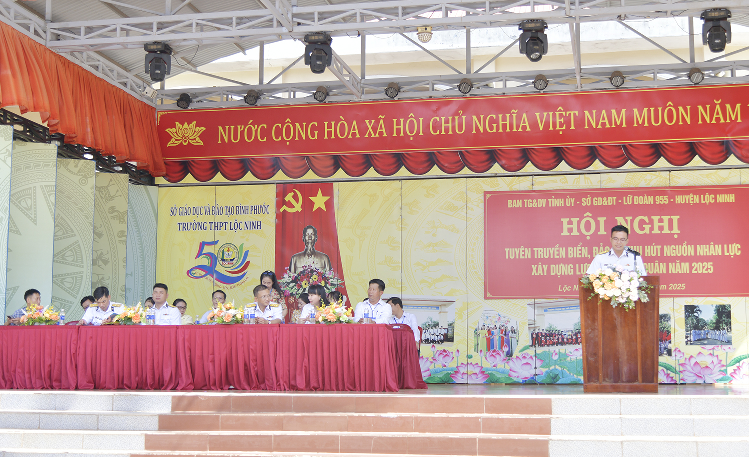 Sáng 31/3, đoàn công tác của Lữ đoàn 955, Vùng 4 Hải quân do Thượng tá Đào Trọng Vĩnh, Phó Chính ủy Lữ đoàn làm trưởng đoàn, đã phối hợp với Ban Tuyên giáo và Dân vận Tỉnh ủy Bình Phước tổ chức tuyên truyền biển đảo và thu hút nguồn nhân lực xây dựng Quân chủng Hải quân năm 2025 tại Trường THPT Thanh Hòa (huyện Bù Đốp) và Trường THPT Lộc Ninh (huyện Lộc Ninh).