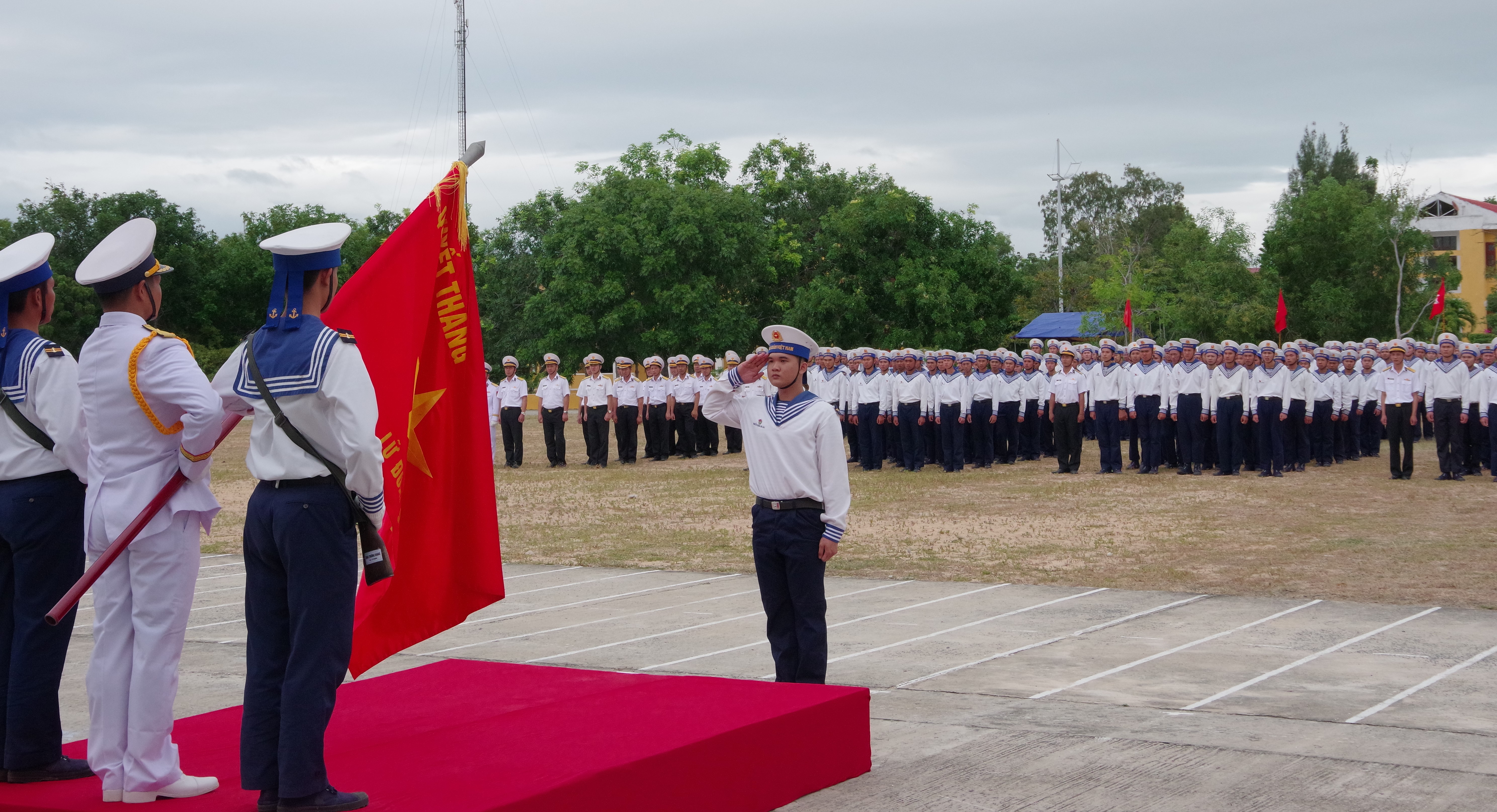 HSQ-CS hoàn thành xuất sắc nghĩa vụ quân sự được tuyên dương, chụp ảnh trước quân kỳ