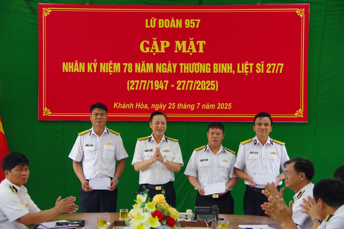 Sáng 25/7, tại Khánh Hòa, Lữ đoàn 957, Vùng 4 Hải quân tổ chức gặp mặt, tặng quà các đồng chí thương binh, bệnh binh đang công tác tại đơn vị nhân kỷ niệm 78 năm Ngày thương binh, liệt sĩ. Dự và trực tiếp trao quà có Đại tá Tiên Quang Sự, Chính ủy Lữ đoàn.