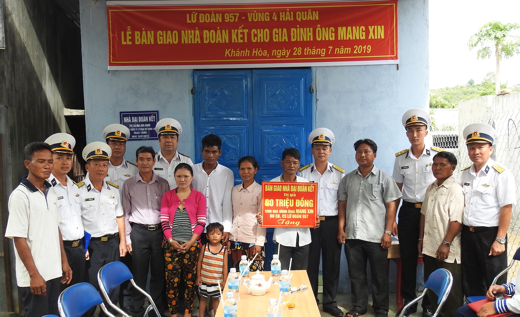 Lữ đoàn còn phối hợp với các nhóm thiện nguyên tặng 100 phần quà cho các gia đình có hoàn cảnh khó khăn, học sinh nghèo với số tiền 30 triệu đồng. Đơn vị đã hoàn thiện và bàn giao nhà đoàn kết diện tích gần 30m2 tặng cho gia đình anh Mang Xin (ở thôn Sông Cạn Trung, xã Cam Thịnh Tây) trị giá 60 triệu đồng. Số tiền này do Bộ Tư lệnh Vùng 4 hỗ trợ 10 triệu đồng; số còn lại do cán bộ, chiến sĩ Lữ đoàn 957 quyên góp ủng hộ. Trong buổi bàn giao nhà, đơn vị còn kết nối với các gia đình hảo tâm tặng gia đình anh Mang Xin các vật dụng trị giá 6 triệu đồng.