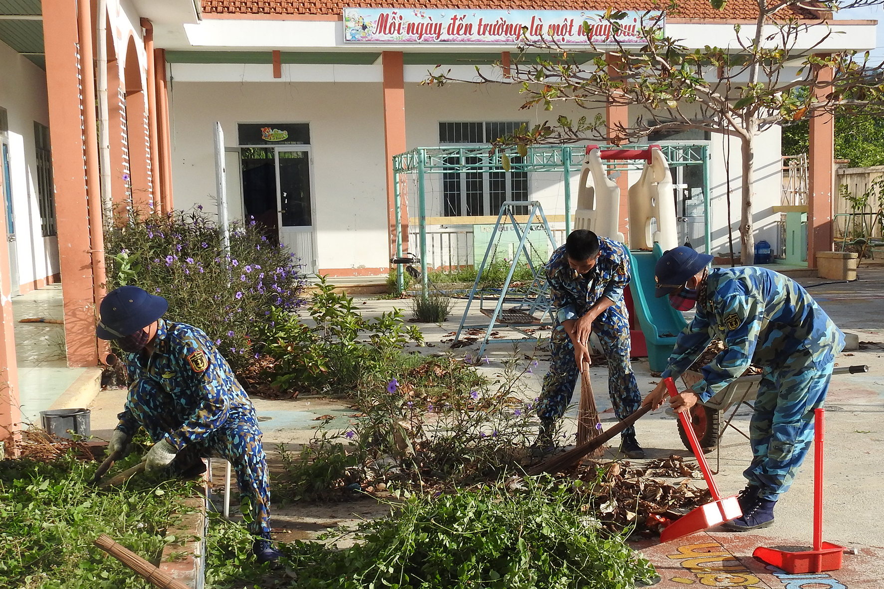 Chiến sĩ Lữ đoàn 957 dọn vệ sinh Trường Mầm non xã Cam Thịnh Tây