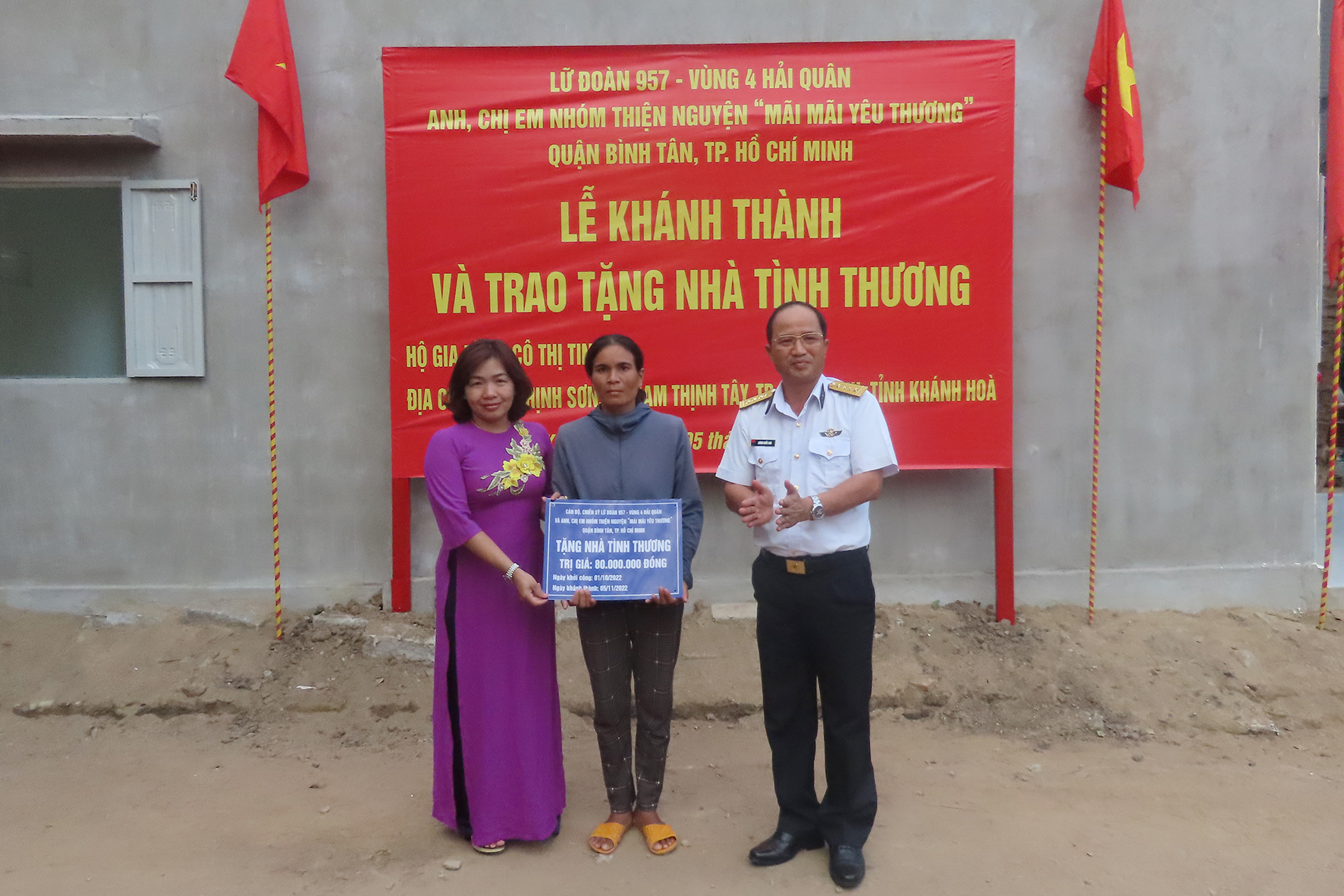 Ngày 5/11, tại xã Cam Thịnh Tây, TP. Cam Ranh, tỉnh Khánh Hòa, Lữ đoàn 957, Vùng 4 Hải quân phối hợp với chính quyền địa phương và đoàn thiện nguyện “Mãi mãi yêu thương” (Quận Bình Tân, TP. Hồ Chí Minh) tổ chức khánh thành và bàn giao 3 ngôi nhà cho các gia đình có hoàn cảnh khó khăn tại địa phương.