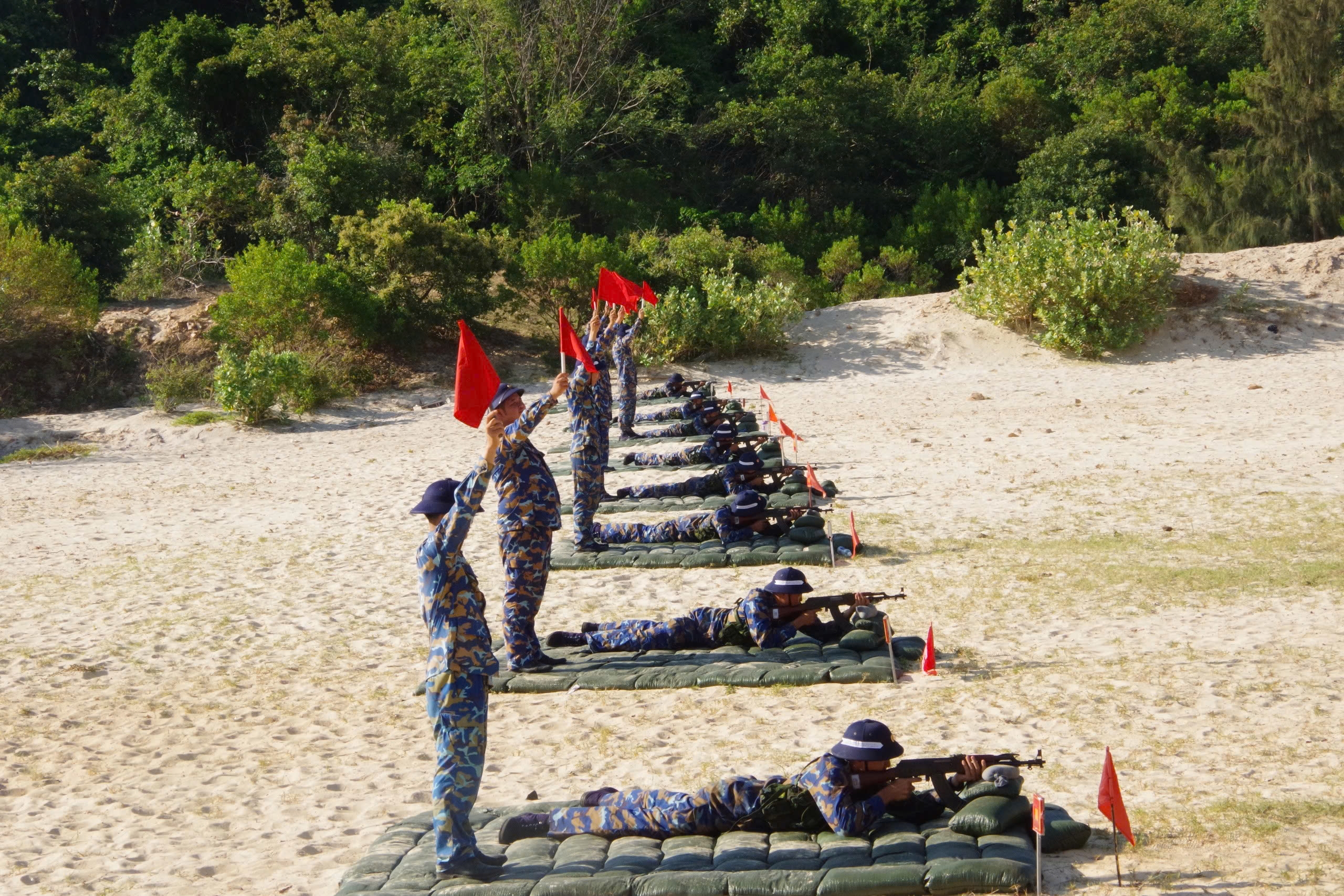 Ngày 28/3, tại Khánh Hòa, Lữ đoàn 957, Vùng 4 Hải quân tổ chức kiểm tra bắn đạn thật lần 1 súng tiểu liên AK (tư thế nằm bắn) cho các chiến sĩ mới (CSM) nhập ngũ năm 2025. Thượng tá Phạm Anh Tuấn, Phó Tư lệnh, Tham mưu trưởng Vùng 4 Hải quân dự, chỉ đạo.