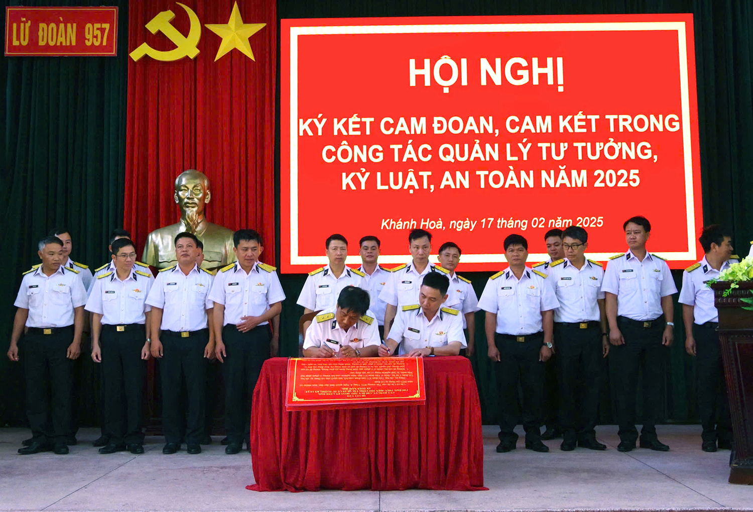 Sáng 17/2, tại Cam Ranh, Khánh Hòa, Lữ đoàn 957, Vùng 4 Hải quân tổ chức hội nghị ký kết cam đoan, cam kết trong công tác quản lý tư tưởng, kỷ luật, an toàn năm 2025.