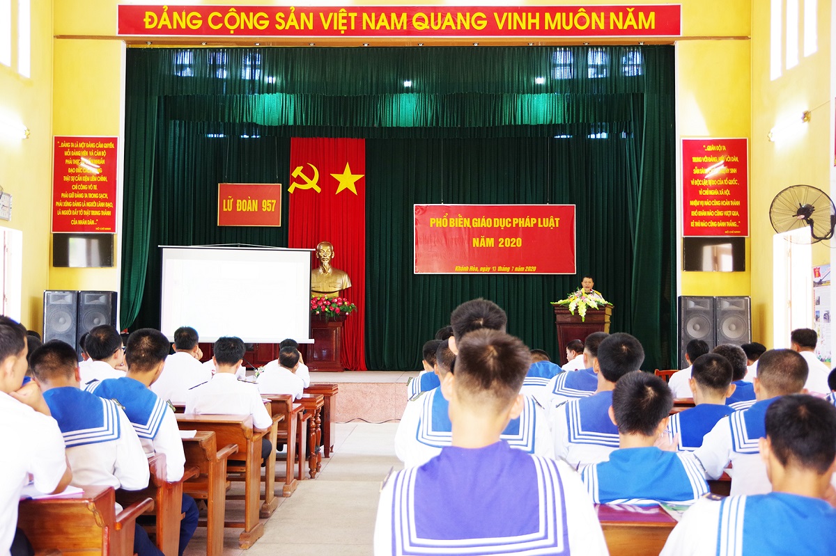 Ngày 13-7, tại TP. Cam Ranh, tỉnh Khánh Hòa, Lữ đoàn 957, Vùng 4 Hải quân phối hợp với Viện Kiểm sát Quân sự Quân chủng Hải quân và Cơ quan Điều tra Hình sự khu vực 2 tổ chức phổ biến, giáo dục pháp luật năm 2020 cho hơn 200 sĩ quan, quân nhân chuyên nghiệp và hạ sĩ quan, chiến sĩ thuộc Lữ đoàn 957 và Tiểu đoàn 458, Vùng 4.
