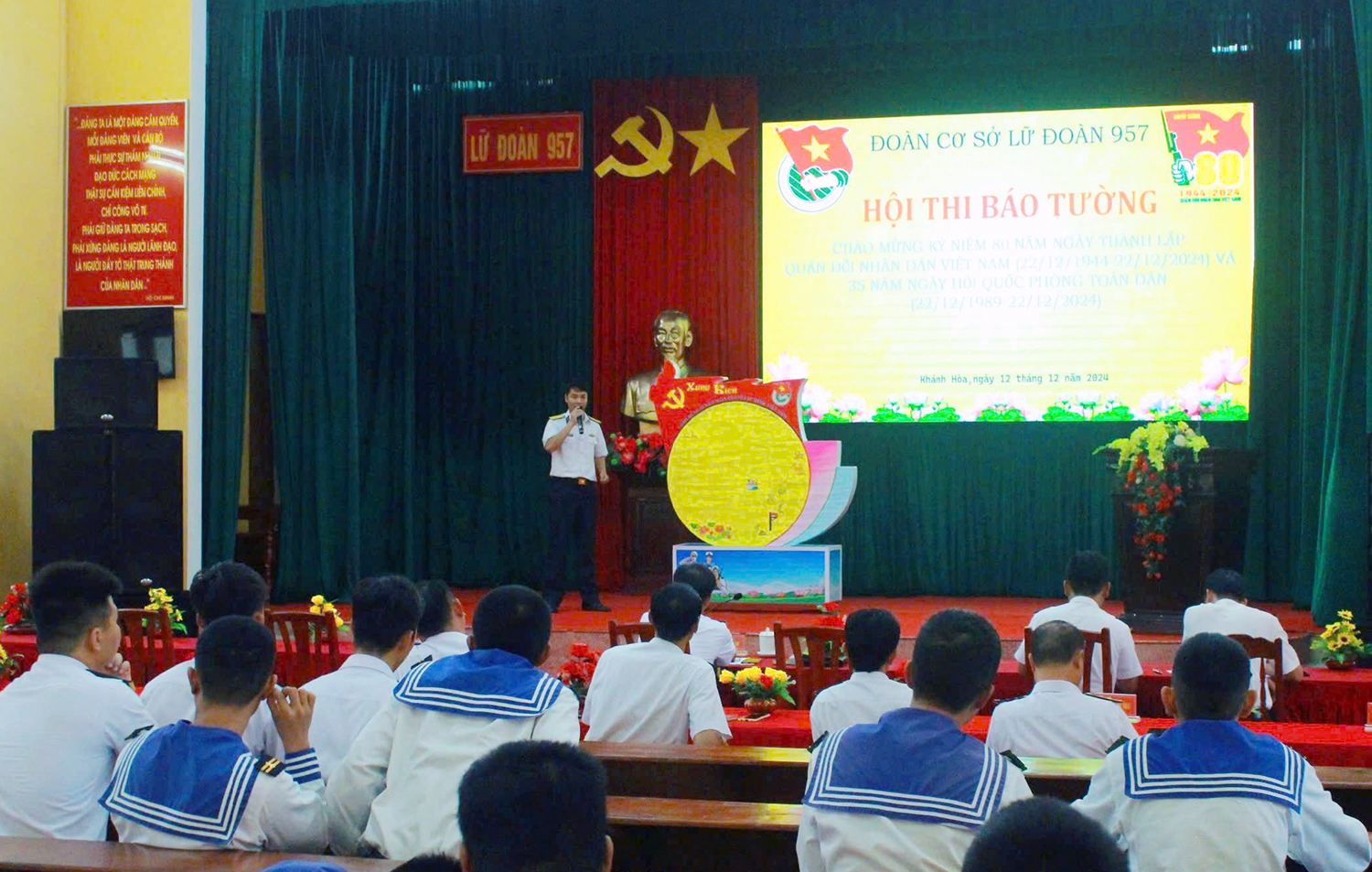Chiều 12/12, tại TP. Cam Ranh, tỉnh Khánh Hòa, Đoàn cơ sở Lữ đoàn 957, Vùng 4 Hải quân tổ chức hội thi báo tường với chủ đề “80 năm vinh quang hào hùng - Tiếp bước cha anh”. Đây là hoạt động chào mừng kỷ niệm 80 năm Ngày thành lập Quân đội nhân dân Việt Nam và 35 năm Ngày hội quốc phòng toàn dân.