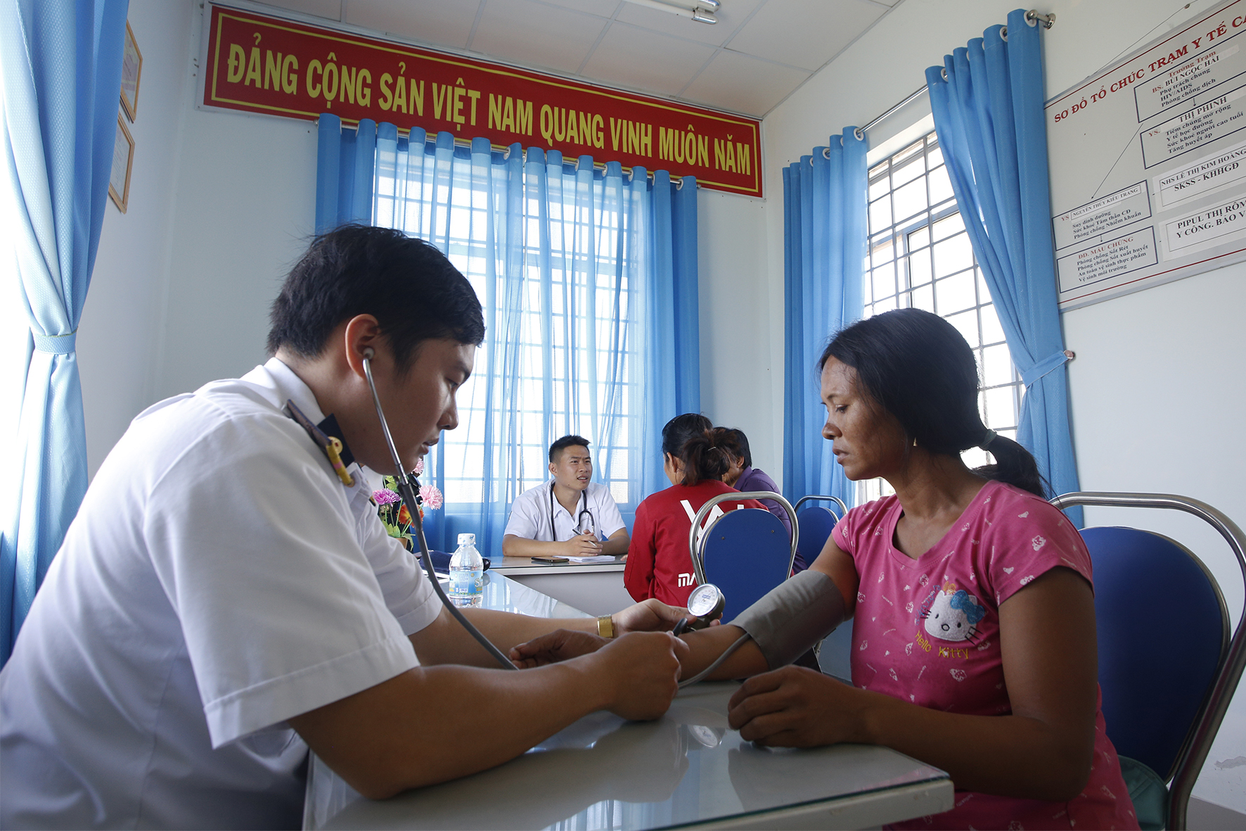Theo chân cán bộ, chiến sĩ Lữ đoàn 957, chúng tôi có mặt tại Trạm y tế xã Cam Thịnh Tây. Hôm nay đơn vị tổ chức khám, tư vấn sức khỏe và cấp thuốc miễn phí cho bà con địa phương. Ngay từ sáng sớm quân y của Lữ đoàn đã có mặt chuẩn bị để buổi khám và tư vấn sức khỏe cho bà con được thuận tiện nhất.