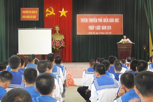 Sáng 14-5, tại TP.Cam Ranh, tỉnh Khánh Hòa, Lữ đoàn 957, Vùng 4 Hải quân phối hợp với Viện Kiểm sát Quân sự Quân chủng Hải quân tổ chức tuyên truyền, phổ biến, giáo dục pháp luật năm 2019 cho gần 700 quân nhân là cán bộ huấn luyện và chiến sĩ mới.