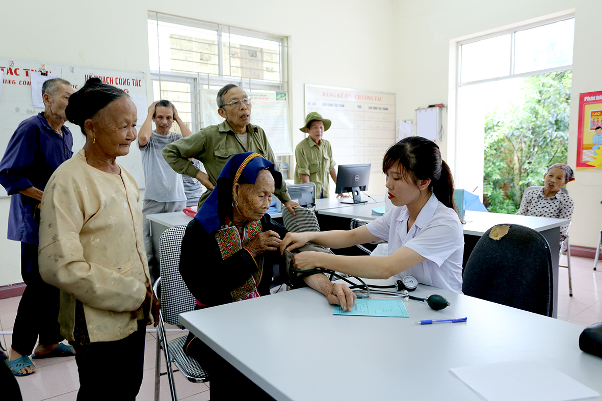 Bác sĩ Bệnh viện Hữu nghị Hà Nội đo huyết áp cho đồng bào dân tộc Dao