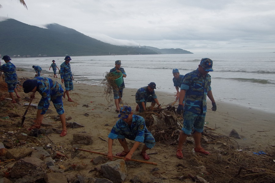 Cán bộ, chiến sĩ Lữ đoàn Công binh 83 Hải quân thu gom rác tại bãi biển phường Thọ Quang, quận Sơn Trà, TP. Đà Nẵng