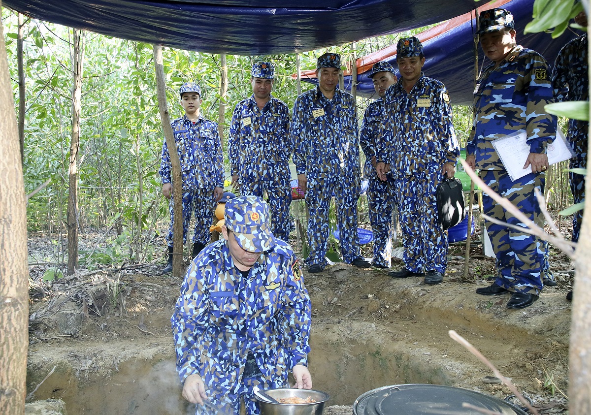 Chỉ huy Lữ đoàn 83 kiểm tra bếp Hoàng Cầm tại khu dã ngoại