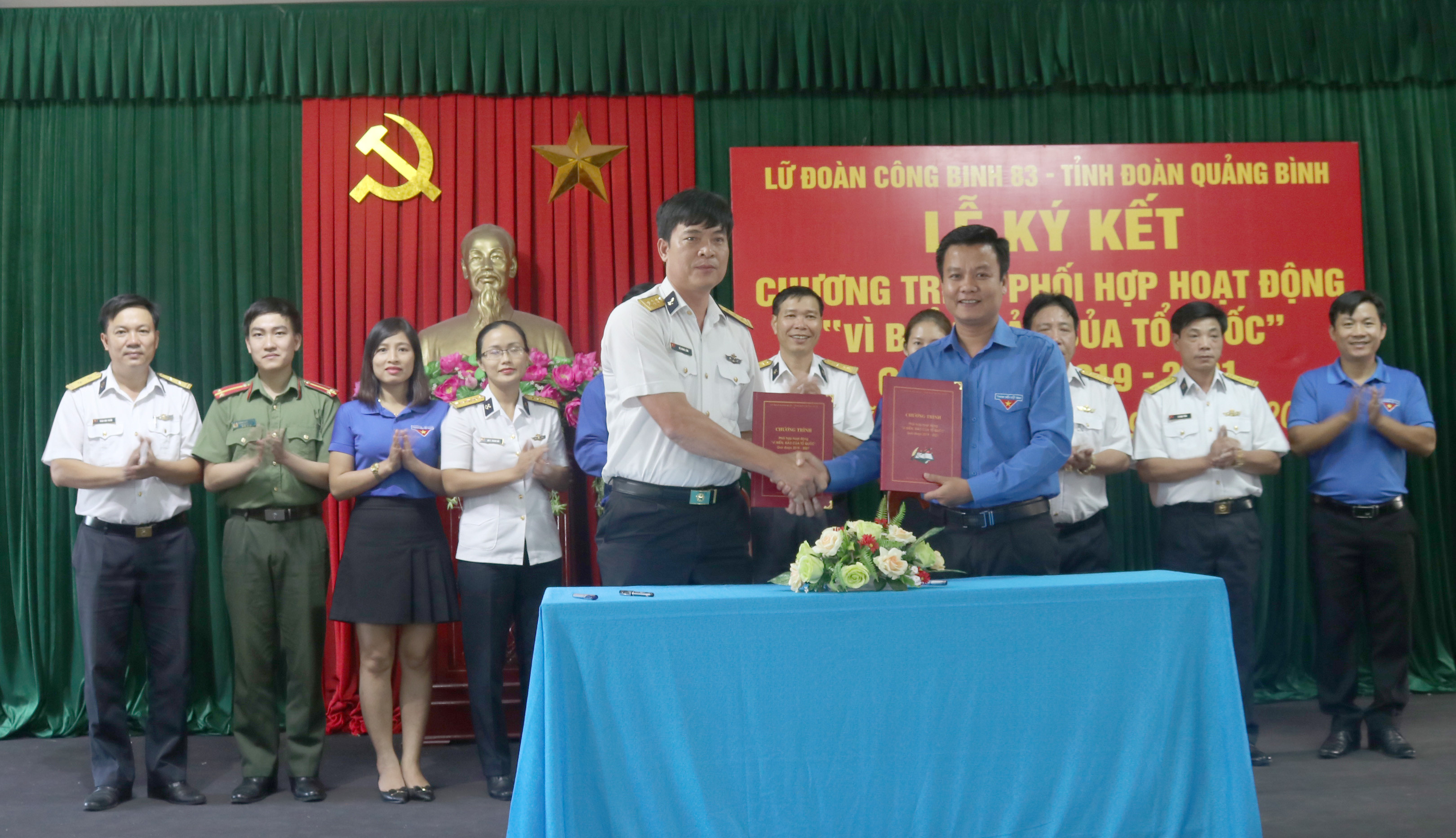 Đại diện lãnh đạo Lữ đoàn 83 Hải quân và Tỉnh đoàn Quảng Bình trao văn bản ký kết phối hợp hoạt động giai đoạn 2019-2021