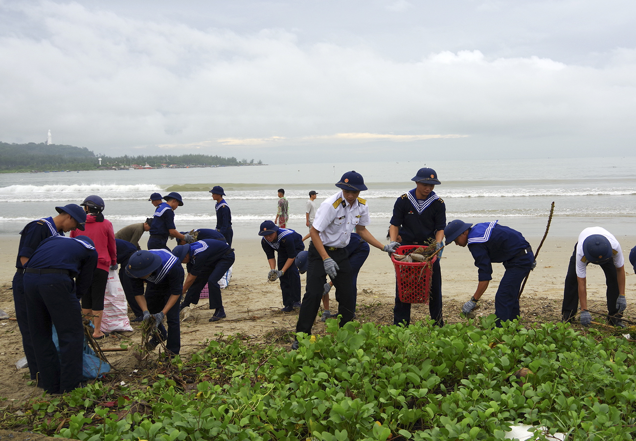 Cán bộ, chiến sĩ Lữ đoàn 83 và nhân dân tổng dọn vệ sinh bờ biển thuộc phường Thọ Quang