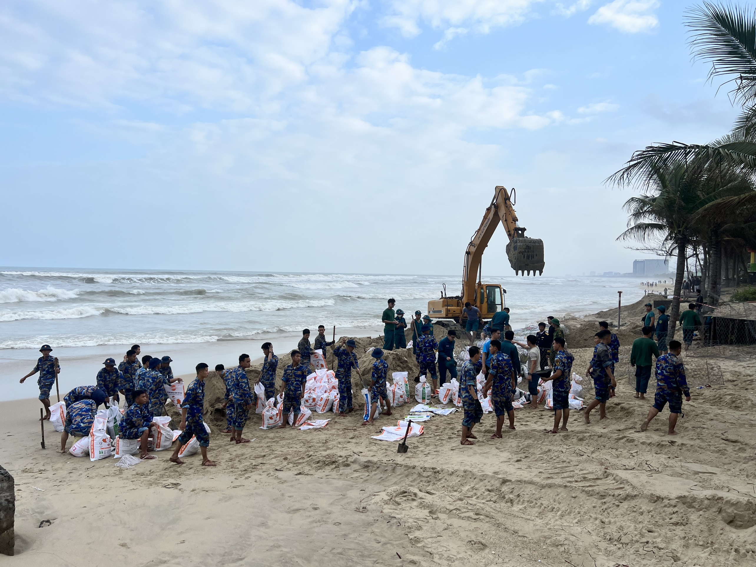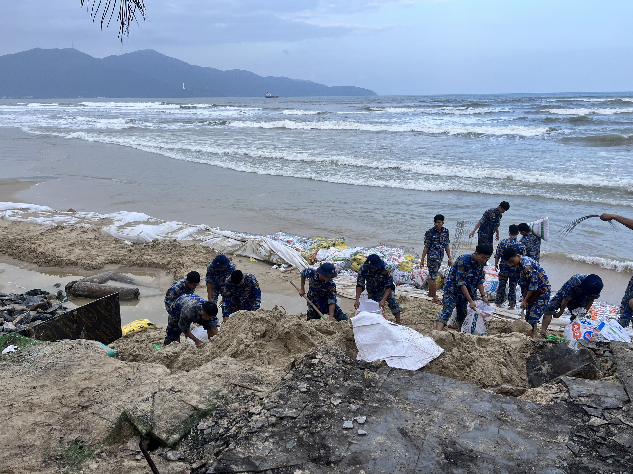 Nhận được đề nghị hỗ trợ của UBND quận Sơn Trà, Lữ đoàn 83 đã huy động gần 50 cán bộ, chiến sĩ cùng các phương tiện phối hợp với các lực lượng và người dân đóng hơn 2.000 bao cát, hàng trăm cọc gỗ để làm kè tạm, chống sạt lở.