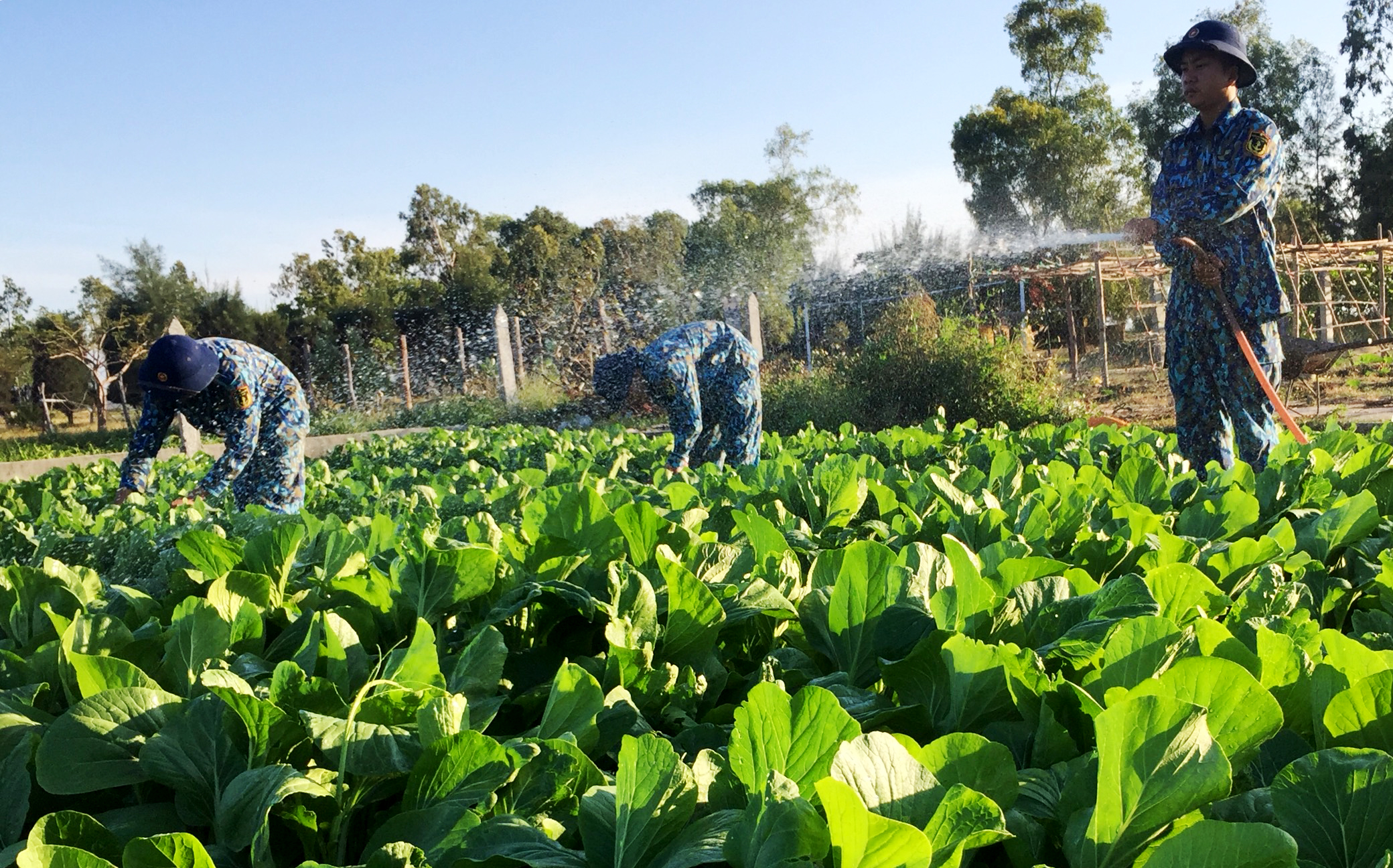 Như để chứng minh lời nói của mình, Trung tá Sự dẫn chúng tôi ra khu tăng gia tập trung. Chỉ tay về phía những vườn rau cải, rau muống, mồng tơi… xanh mướt; những giàn bầu, bí xanh trĩu quả đang tới kỳ thu hoạch, anh cho biết thêm: “Với điều kiện thiên nhiên khô cằn như vậy, Lữ đoàn đã tìm được điểm mấu chốt để tạo đột phá cho công tác tăng gia của đơn vị, đó chính là xây dựng hệ thống ống dẫn nước ngọt dài 1,5km từ Cam Lâm về góp phần ngọt hóa đất đai, tạo điều kiện thuận lợi cho trồng trọt, chăn nuôi và xây dựng cảnh quan môi trường.