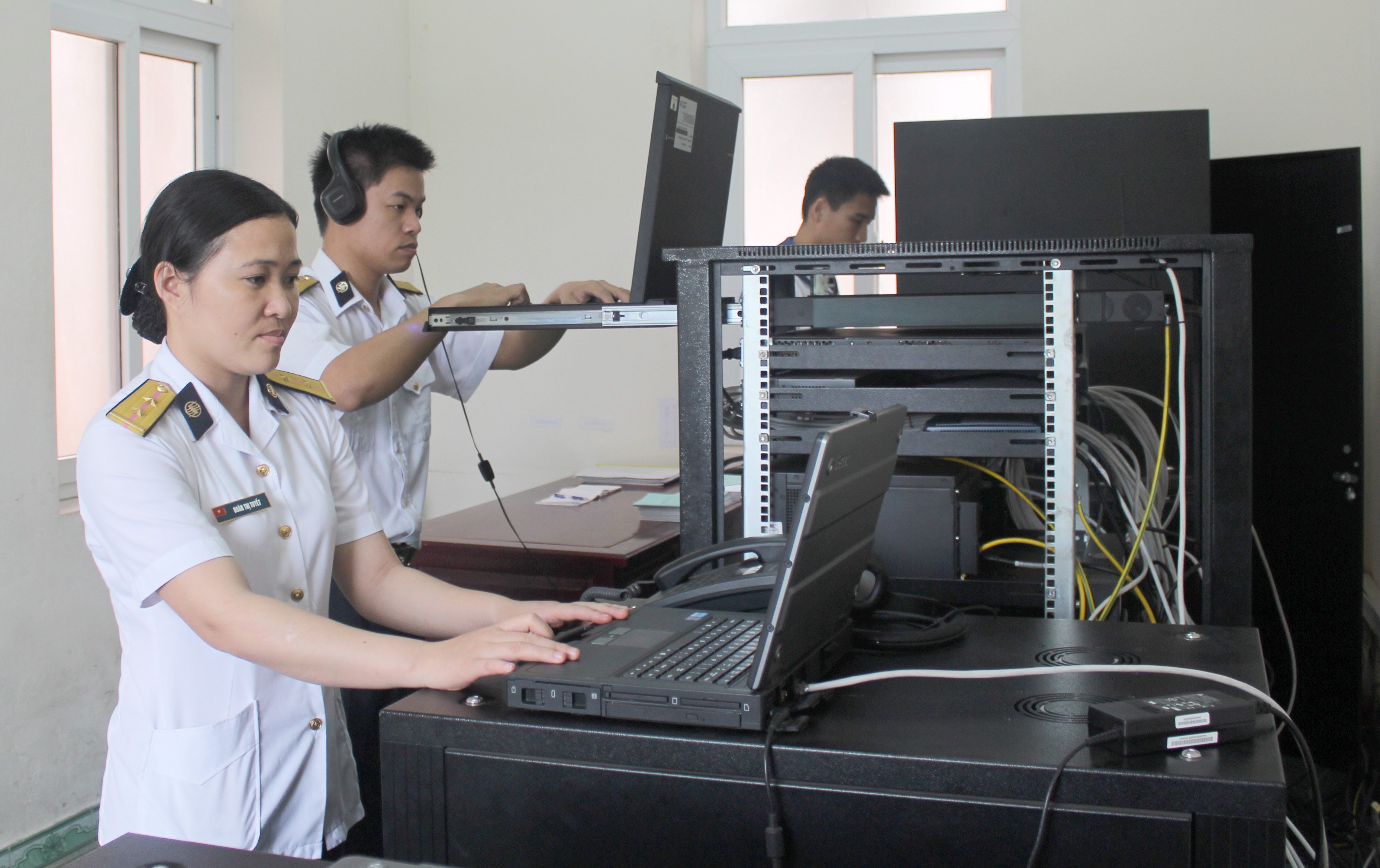 Nhân viên Lữ đoàn Thông tin 602 thực hiện nhiệm vụ chuyên môn tại phòng máy công nghệ cao