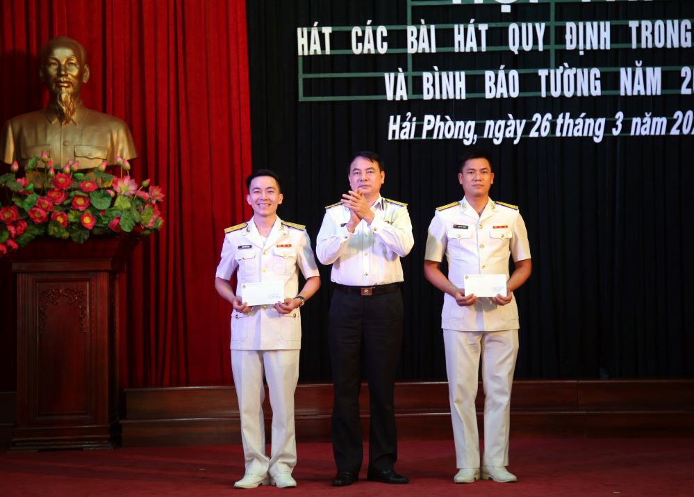 Thủ trưởng Phòng Chính trị Bộ Tham mưu trao thưởng tiết mục hát và phần bình báo tường xuất sắc nhất