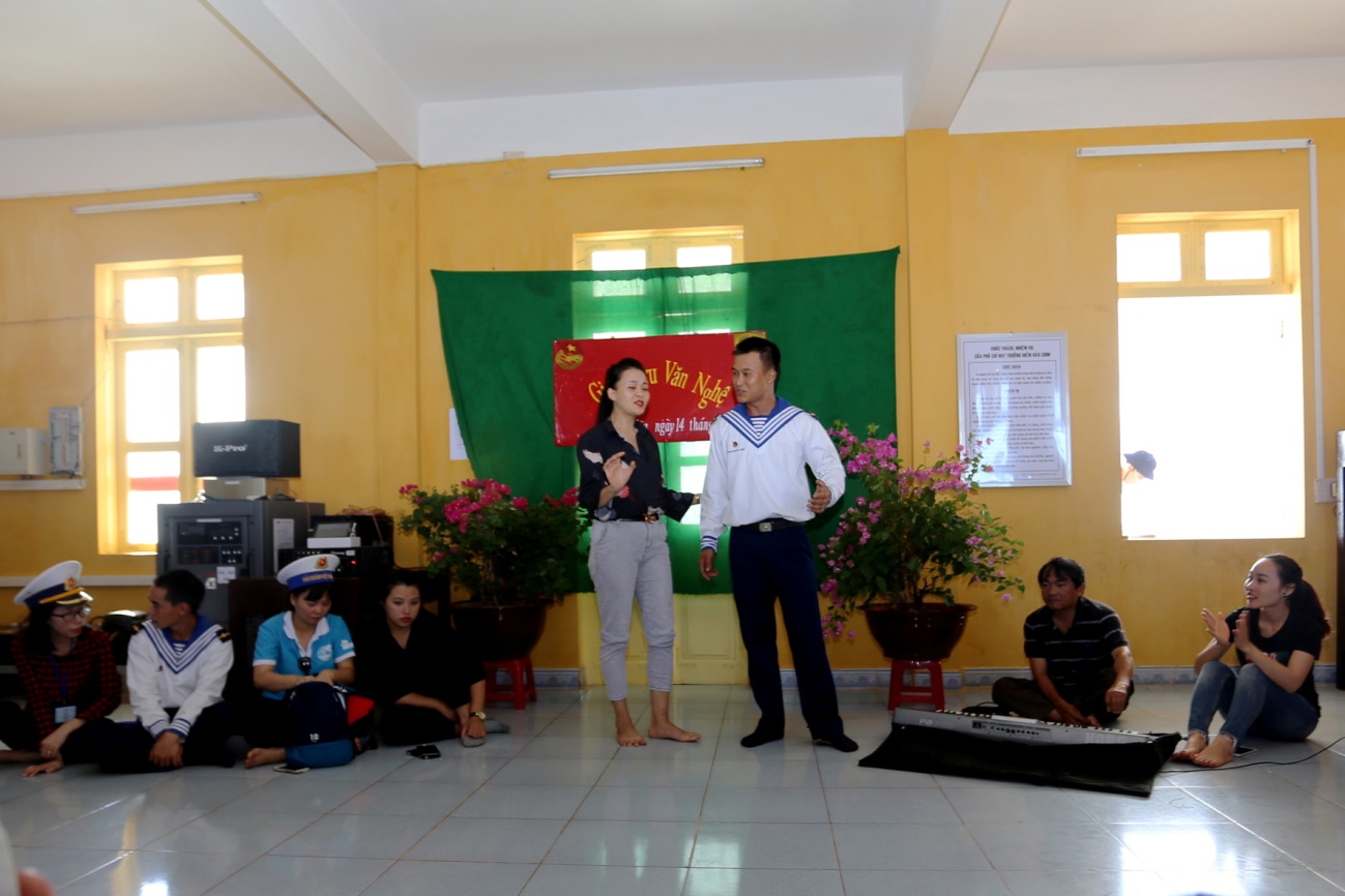Thành viên Đoàn công tác giao lưu văn nghệ với cán bộ, chiến sĩ đảo Thuyền Chài. Ảnh: Thanh Thủy