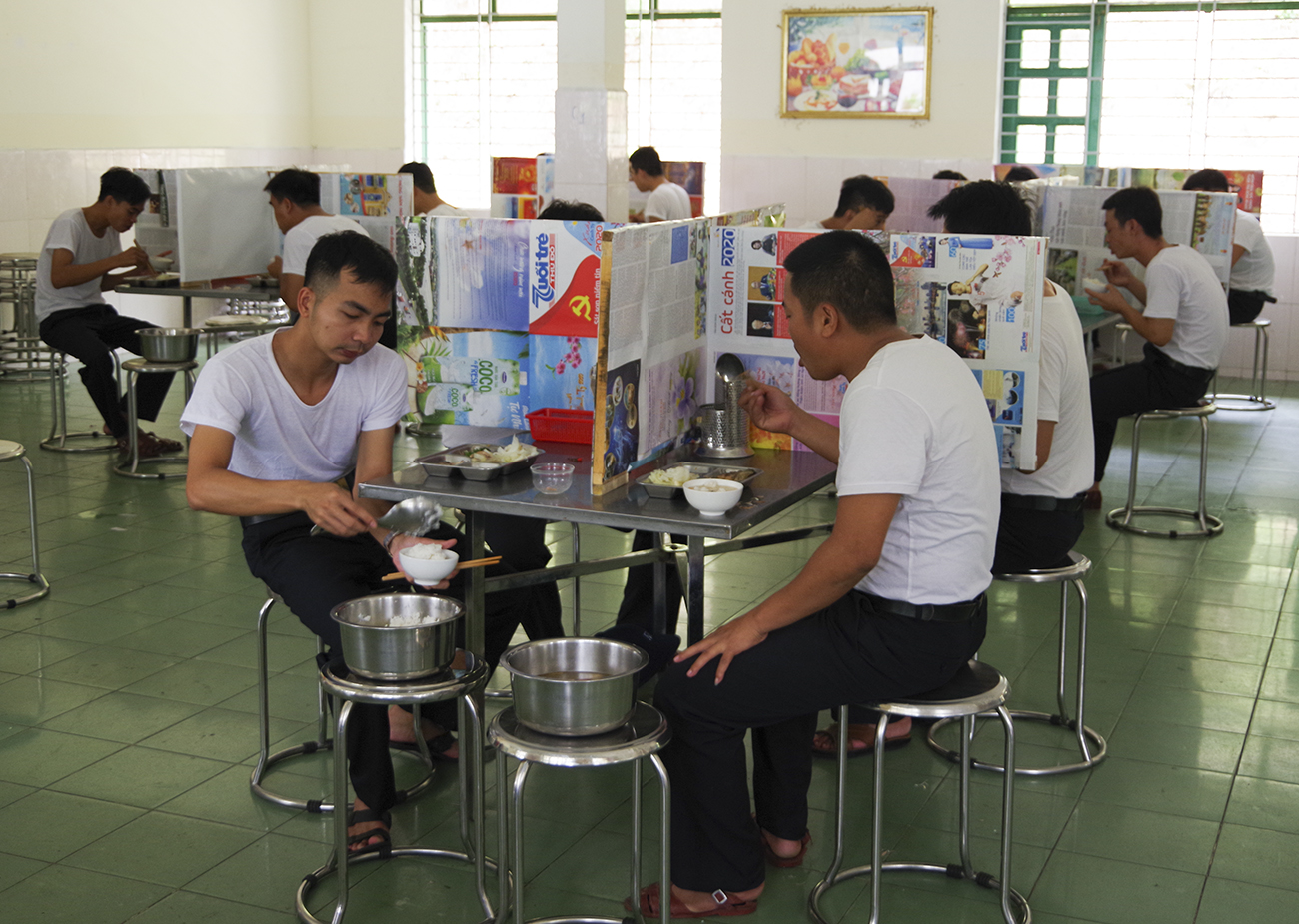 Bàn ăn được ngăn vách từng người tại bếp ăn Lữ đoàn