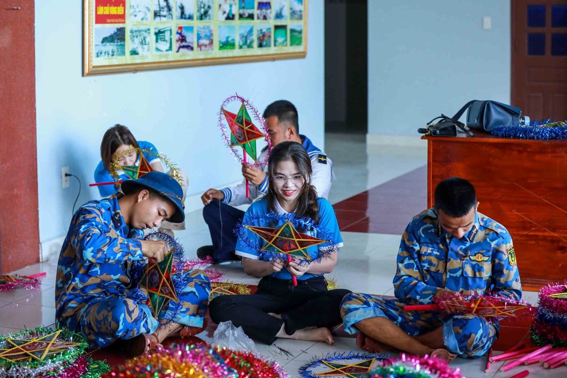 Có mặt tại hội trường Bộ Tư lệnh Vùng 5 từ sớm, chúng tôi cảm nhận không khí vui Trung thu ở đây thật rộn ràng, ấm áp. Cán bộ, chiến sĩ Vùng 5 miệt mài trang trí sân khấu cho buổi diễn. Còn thành viên Câu lạc bộ “Tuổi trẻ vì biển, đảo quê hương”-những người đến từ khắp mọi miền Tổ quốc cũng không kém phần bận rộn, người chia sữa, người chia bánh kẹo, đồ dùng học tập... sắp xếp vào từng túi; người chỉnh sửa, làm đẹp đèn ông sao để tặng cho các cháu.