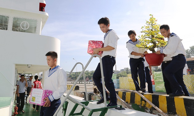 Các chiến sĩ Vùng 2 Hải quân chuyển quà tết lên tàu cho đồng đội ngoài nhà giàn