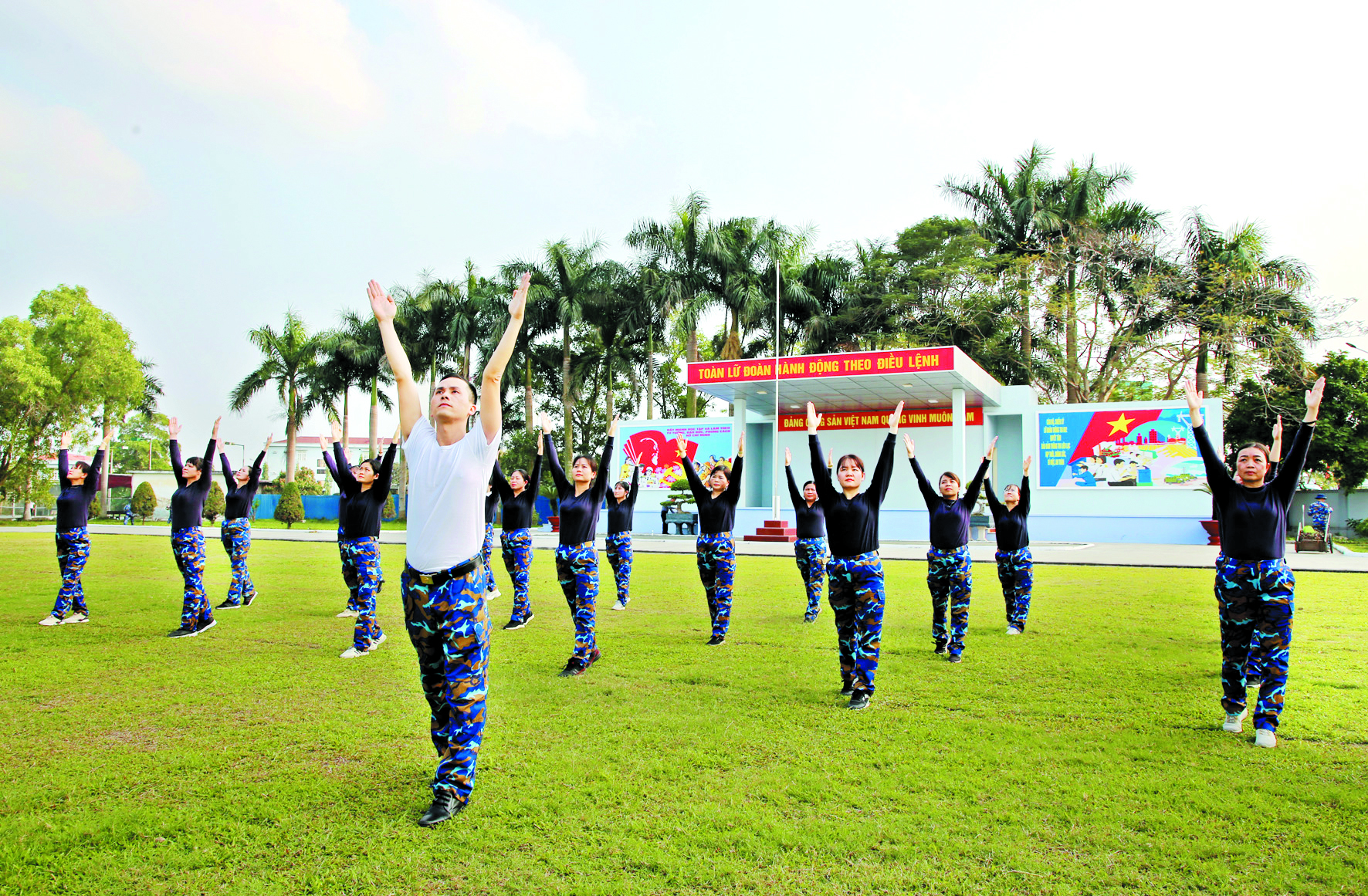 Nữ quân nhân Lữ đoàn 602 luyện tập bài thể dục buổi sáng