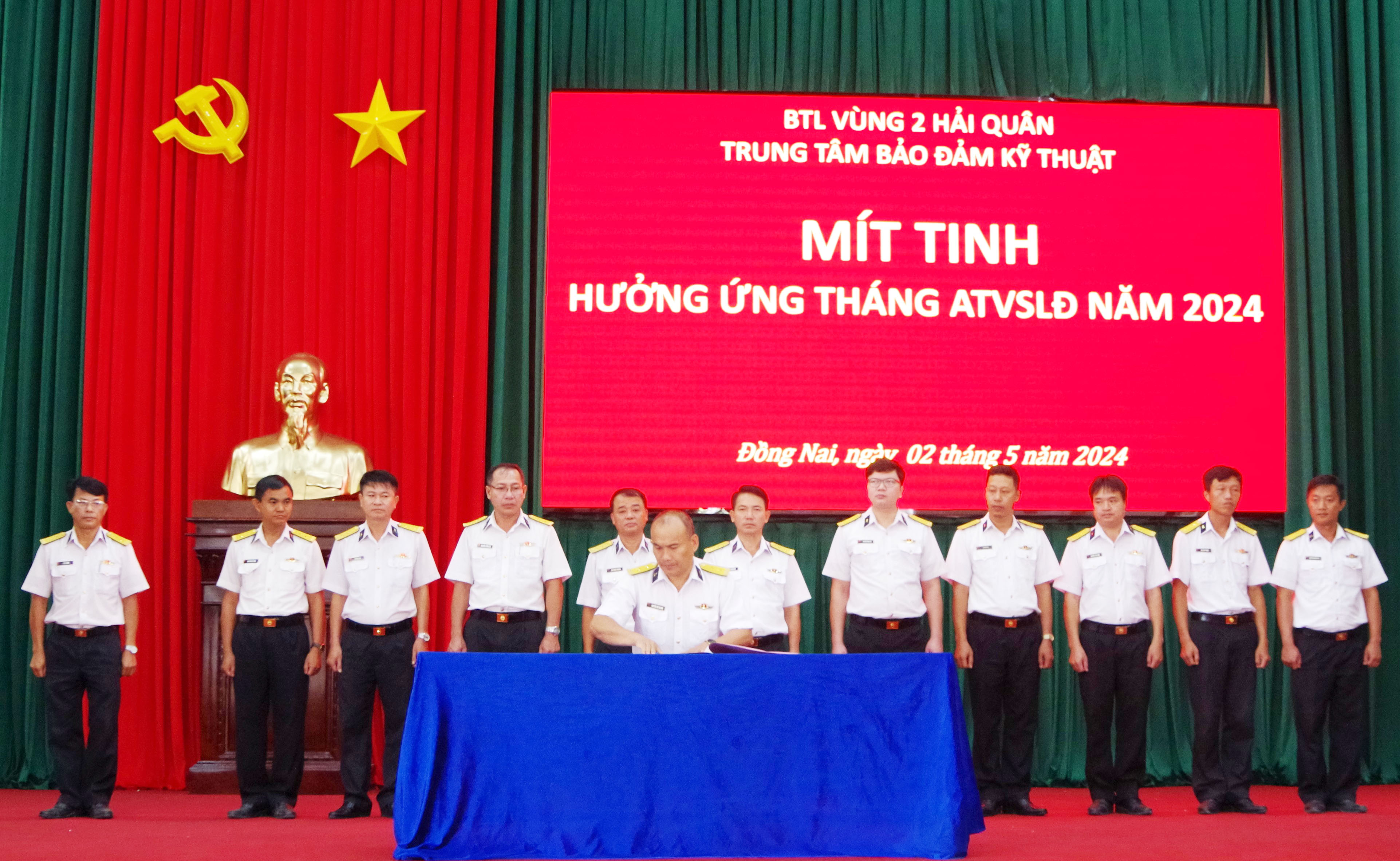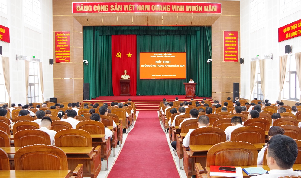 Sáng 2/5, tại huyện Nhơn Trạch, tỉnh Đồng Nai, Trung tâm Bảo đảm kỹ thuật Vùng 2 Hải quân tổ chức mít tinh hưởng ứng Tháng hành động về an toàn, vệ sinh lao động (AT-VSLĐ) năm 2024. Đại tá Nguyễn Thanh Hà, chỉ huy trưởng Trung tâm dự chỉ đạo.