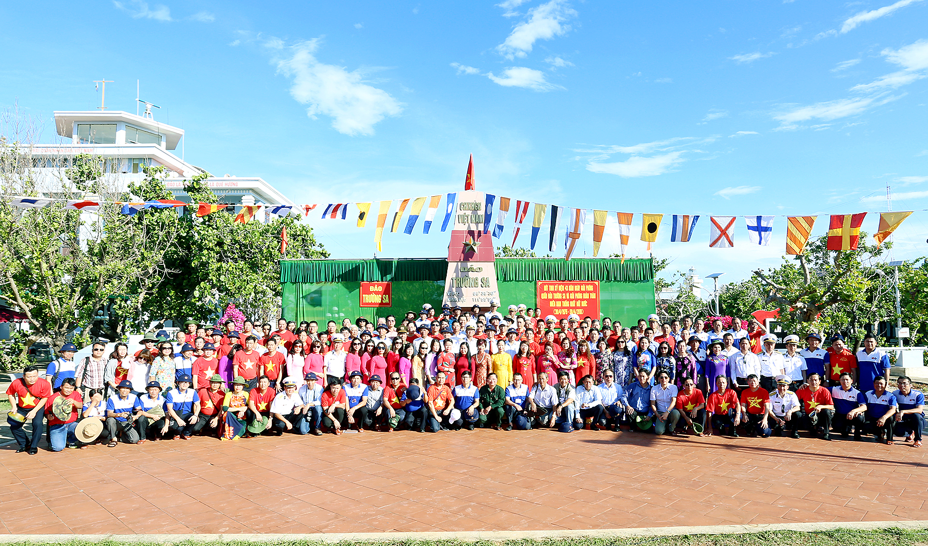 Đoàn công tác cùng quân dân Thị trấn Trường Sa chụp ảnh lưu niệm bên cột mốc chủ quyền