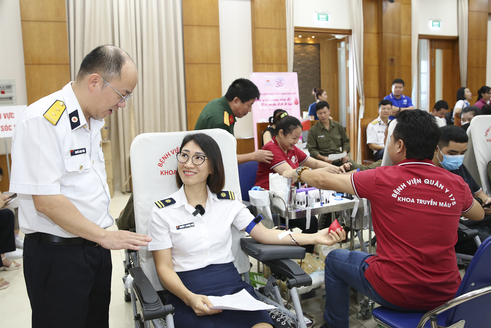 Chúng tôi đến vị trí nào trong đợt hiến máu này cũng được thấy nụ cười của cán bộ, nhân viên và đoàn viên. Niềm vui được lan tỏa để rồi không ai bảo ai, tất cả đều tự giác vào bàn đăng ký và đến các vị trí để được hiến máu theo sự điều hành của Ban tổ chức. Đại tá Nguyễn Xuân Vũ, Trưởng khoa Truyền máu, Bệnh viện Quân y 175 cho biết: Tổ chức hiến máu tại Tổng công ty Tân cảng Sài Gòn lần nào cũng rất thuận lợi cho công tác tiếp nhận máu, bởi vì đối tượng cho máu ở đây trẻ tuổi và có sự đồng đều về sức khỏe. Điều làm chúng tôi ấn tượng nhất chính là tinh thần, thái độ của mỗi cán bộ, nhân viên và người lao động khi cho máu. Sự phối hợp tuyên truyền, vận động giữa 2 đơn vị cũng rất chuyên nghiệp, đem lại nhiều thuận lợi cho mỗi đợt hiến máu.