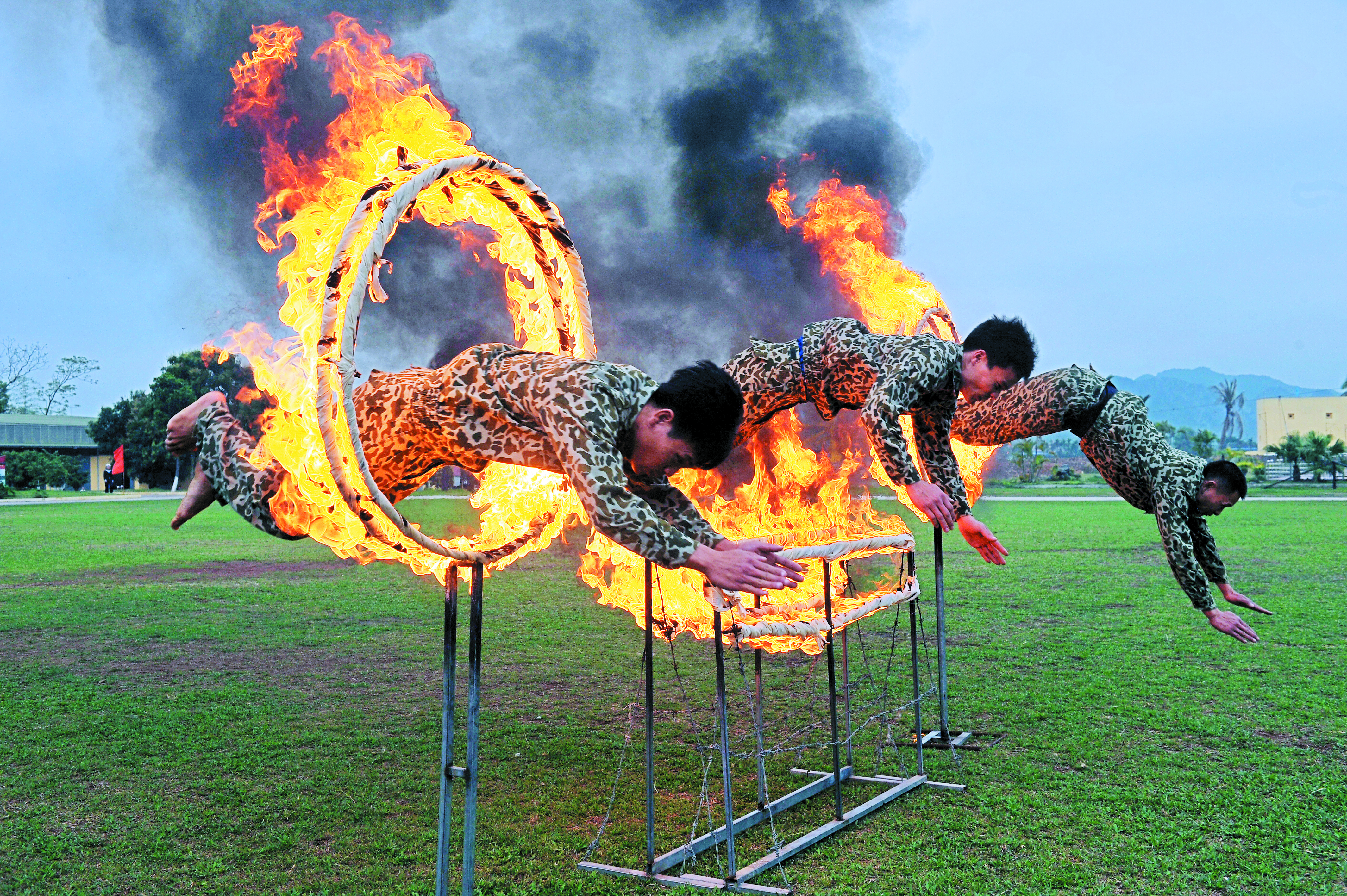 Được lời như cởi tấm lòng, tôi theo chân Thượng tá Hoàng Văn Vĩnh tham quan các chiến sĩ đặc nhiệm chống khủng bố luyện tập. Tại sân vận động Lữ đoàn 126, chúng tôi được chứng kiến những màn biểu diễn võ thuật ngoạn mục của bộ đội đặc công, những pha nhảy cao công phá mục tiêu, những bài quyền mềm mại, uyển chuyển nhưng đầy uy lực làm người xem ngỡ ngàng và thán phục.
