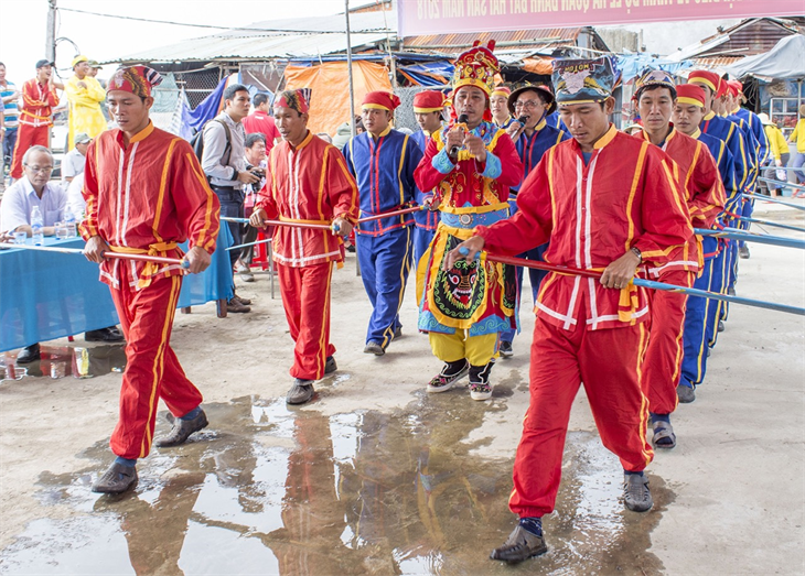 Ngư dân vạn chài Hải Ninh ở xã Bình Thạnh, huyện Bình Sơn, tỉnh Quảng Ngãi biểu diễn điệu múa bả trạo trước giờ xuất hành đầu Xuân