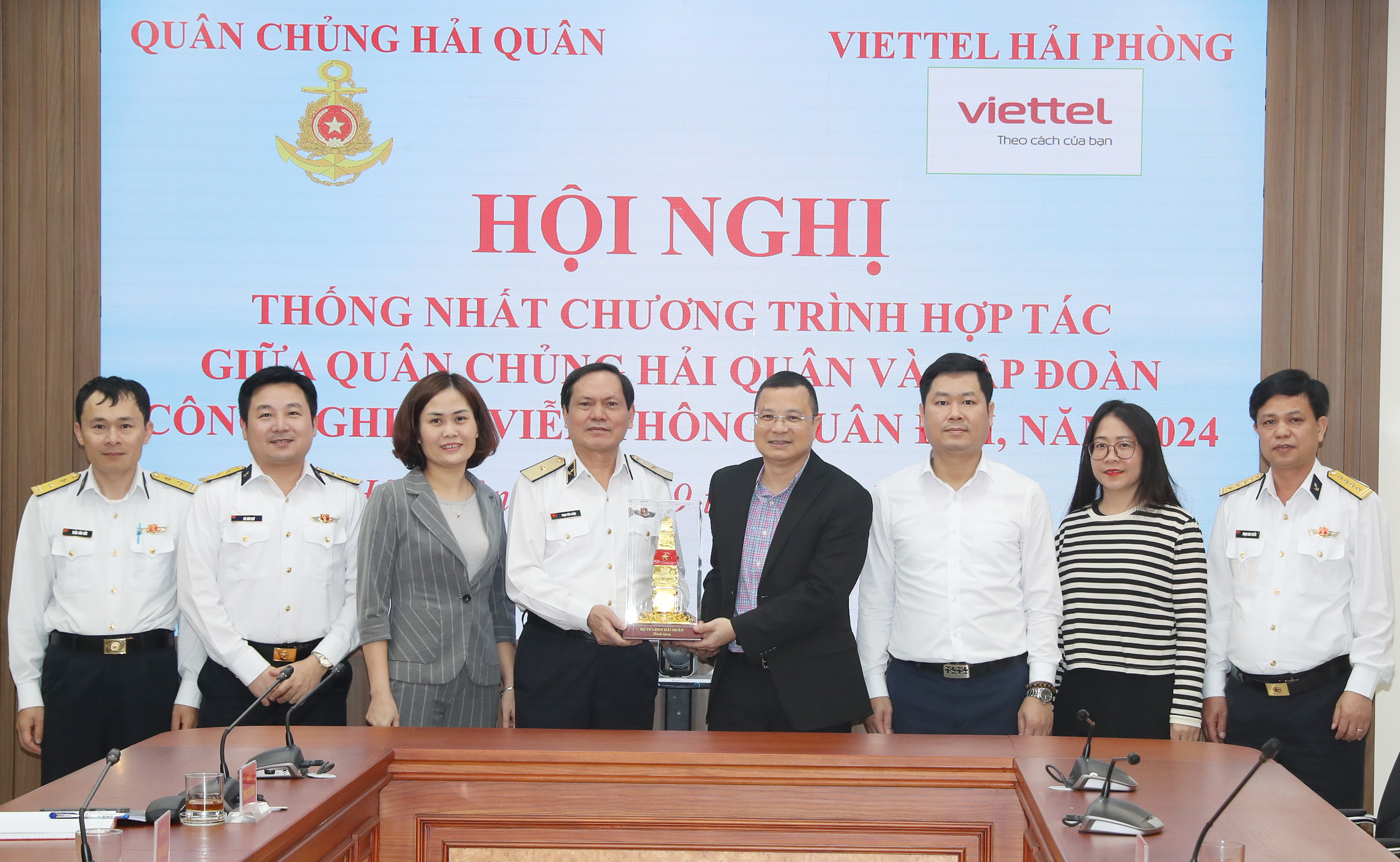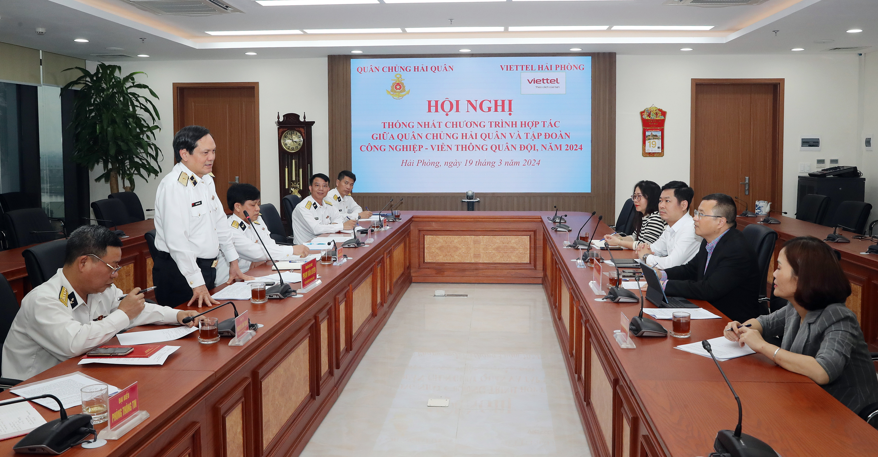 Chiều 19/3, tại Hải Phòng, Quân chủng Hải quân và Tập đoàn Công nghiệp - Viễn thông Quân đội (Viettel) tổ chức Hội nghị thống nhất chương trình hợp tác năm 2024. Chuẩn Đô đốc Phạm Văn Luyện, Phó Chủ nhiệm Chính trị Hải quân và Thượng tá Nguyễn Đức Châu, Giám đốc Viettel Hải Phòng đồng chủ trì.