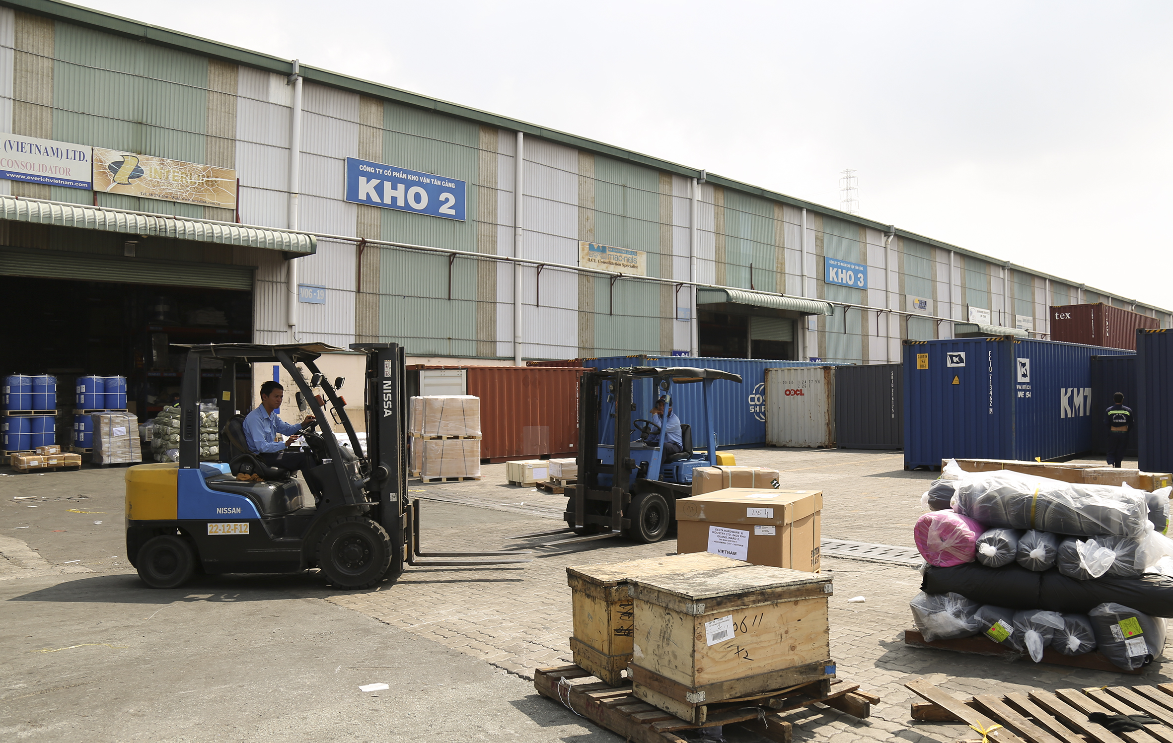 Công nhân Kho vận Tân cảng Sài Gòn vận chuyển hàng hóa. Ảnh: Quang Tiến