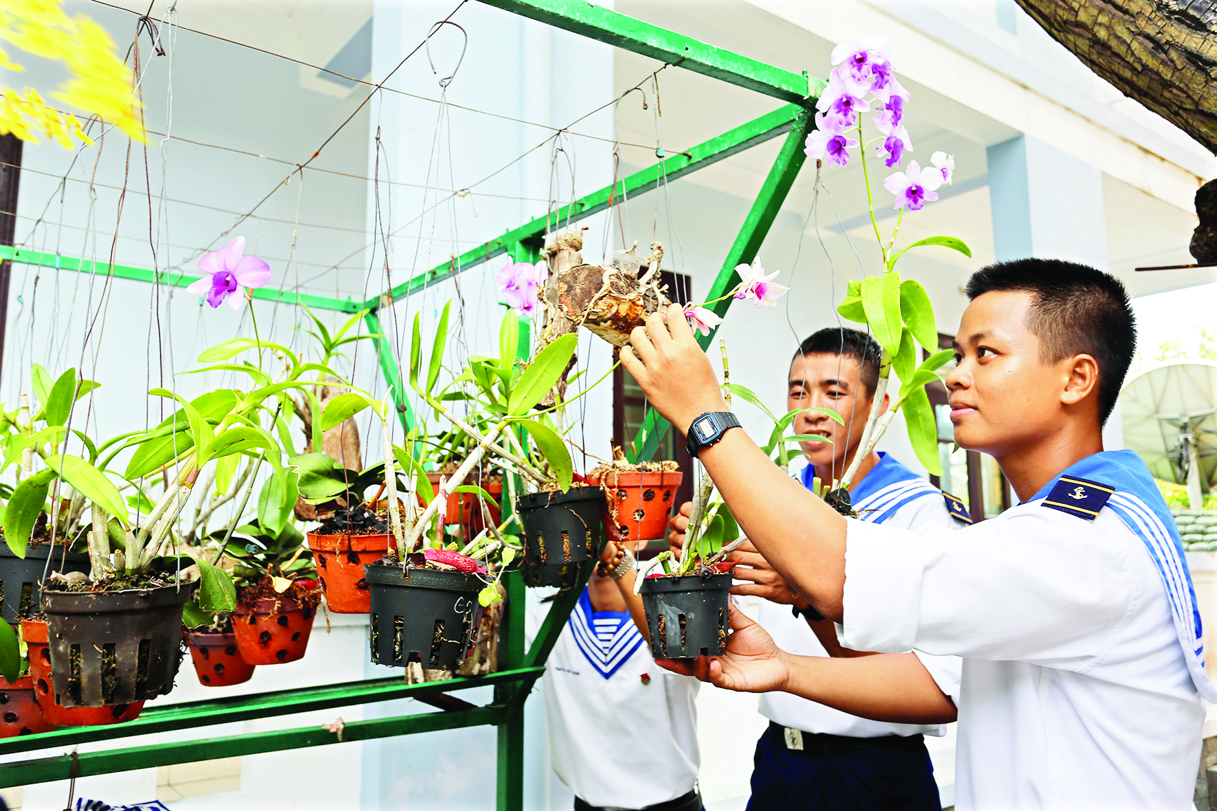 Chiến sĩ đảo Sinh Tồn chăm sóc giàn hoa lan. Ảnh: Thanh Thủy