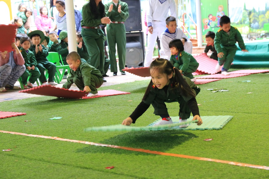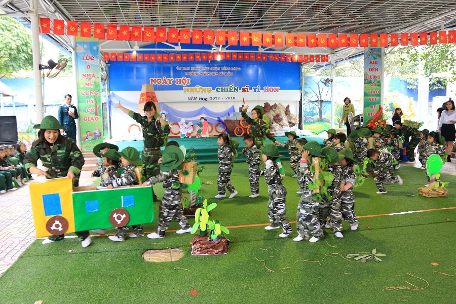 Ngày hội diễn ra trong không khí vui vẻ, tự nhiên, phấn khởi. Các cháu Trường Mầm non trong trang phục bộ đội Hải quân, Phòng không-Không quân và Bộ binh vô cùng nhanh nhẹn, vui tươi tham gia các màn đồng diễn đặc sắc “Hát mãi khúc quân hành”, “Ba lô con cóc”, “Cháu hát về đảo xa”, hoạt cảnh “Tái hiện màn sơ tán thời chiến” và các trò chơi vận động khỏe khoắn, vui nhộn “Trườn sấp và vượt sông”, “Bò chui qua hầm và chèo thuyền”...