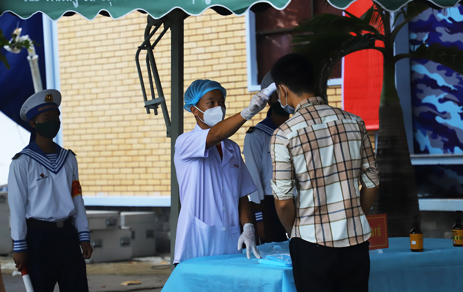 Tất cả các cử tri được kiểm tra thân nhiệt, rửa tay sát khuẩn trước khi bầu cử.
