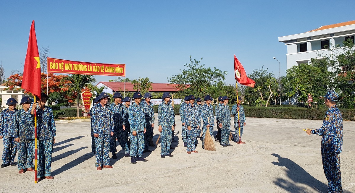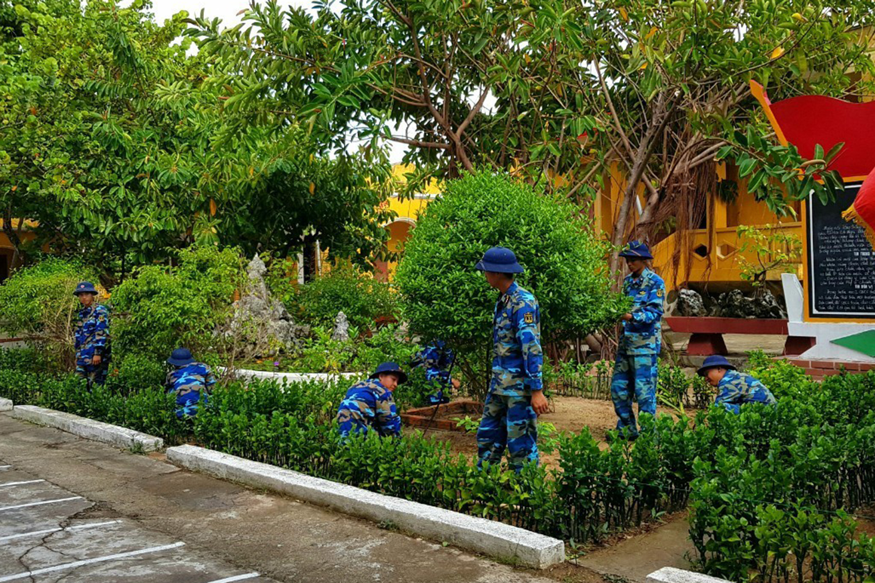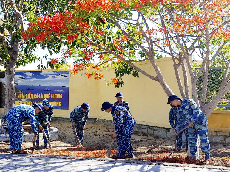 Cán bộ, đoàn viên Đoàn cơ sở Trung đoàn 451, Vùng 4 Hải quân dọn vệ sinh khuôn viên đơn vị. Ảnh: Hồng Phong