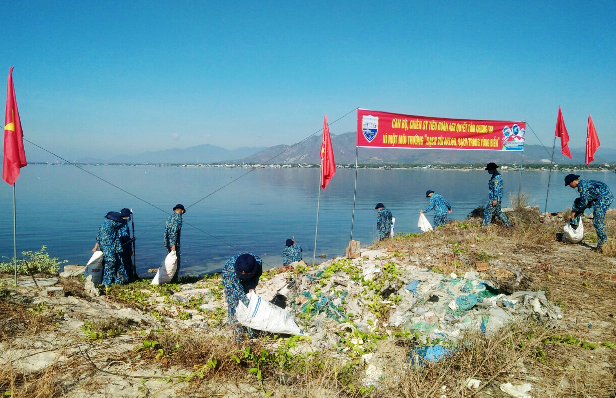 Cán bộ, đoàn viên Tiểu đoàn 458, Vùng 4 Hải quân thu gom rác thải khu vực bờ biển xung quanh đơn vị. Ảnh: Văn Bun