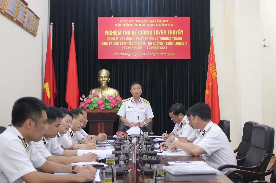 Sáng 4/8, tại Hải Phòng, Hội đồng Khoa học quân sự Cục Kỹ thuật Hải quân tổ chức nghiệm thu “Đề cương tuyên truyền 30 năm xây dựng, phát triển và trưởng thành của Trung tâm Tiêu chuẩn-Đo lường-Chất lượng 1 (17/9/1992 - 17/9/2022”. Đại tá Ngô Văn Thành, Bí thư Đảng ủy, Chính ủy Cục Kỹ thuật, Chủ tịch Hội đồng chủ trì.
