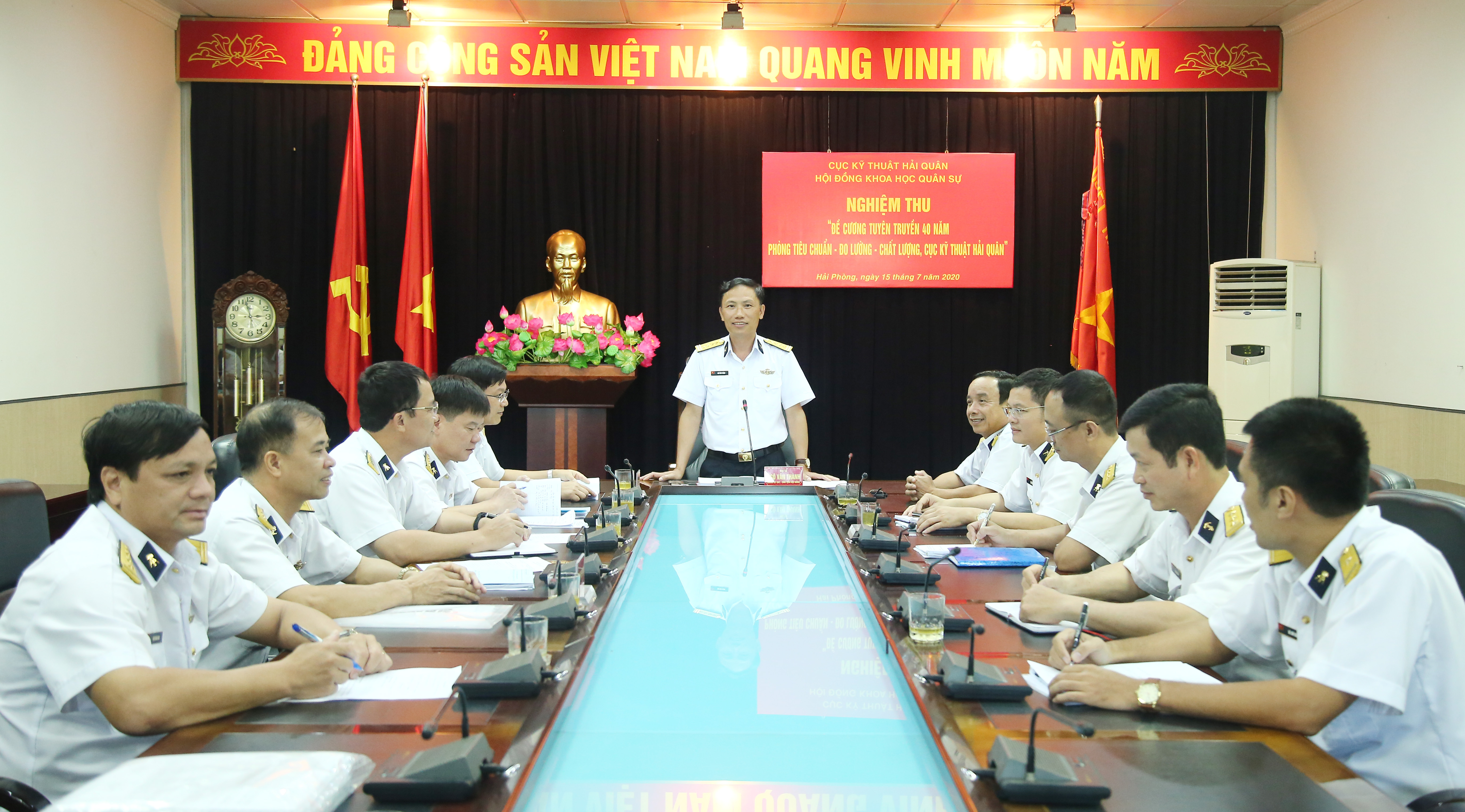 Chiều 15-7, tại Hải Phòng, Hội đồng Khoa học quân sự Cục Kỹ thuật Hải quân tổ chức nghiệm thu công trình "Đề cương tuyên truyền 40 năm Phòng Tiêu chuẩn - Đo lường - Chất lượng (1980 - 2020). Đại tá Ngô Văn Thành, Bí thư Đảng ủy, Chính ủy Cục Kỹ thuật, Chủ tịch Hội đồng chủ trì.