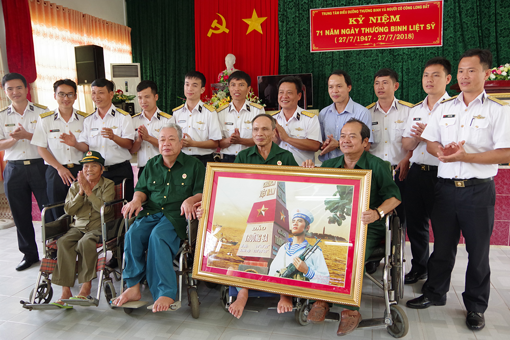 Đến với Trung tâm lần này, chúng tôi gửi tặng các thương-bệnh binh bức ảnh “Chiến sĩ Hải quân bên cột mốc chủ quyền”. Bác Trần Khắc Hải, Thương binh hạng ¼ đánh xe lăn lên sát sân khấu để nhìn bức ảnh được rõ hơn. Hơn 30 năm ở Trung tâm, đây là lần đầu tiên bác nhìn thấy bức ảnh này. Bác ngồi rất lâu, ngắm nhìn cột mốc chủ quyền đảo Trường Sa một cách say sưa. Bác xúc động: Nếu cần thiết, tôi vẫn muốn xung phong chiến đấu để bảo vệ chủ quyền biển, đảo Tổ quốc.