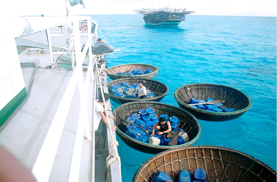 Tàu Lữ đoàn 161 hỗ trợ nước ngọt cho ngư dân trên biển. Ảnh: PV