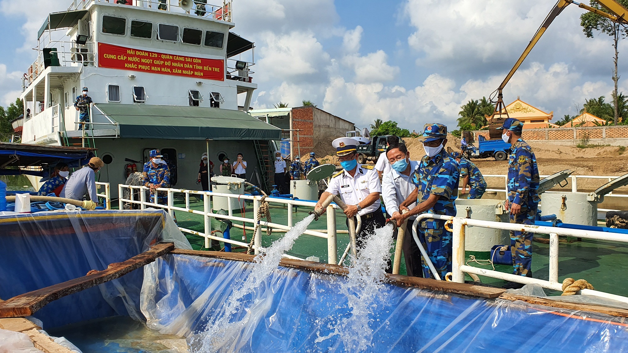 Sau hơn một ngày hành trình đường biển và đường sông, Tàu 937 Hải đoàn 129, Tổng công ty Tân cảng Sài Gòn chở theo 300 nghìn lít nước ngọt (chuyến thứ 5) cập bến Vàm Mơn, huyện Chợ Lách để cung cấp cho gần 500 hộ dân. Sau khi cập bến cán bộ, chiến sĩ Tàu 937, tiến hành bơm nước ngọt lên các xe bồn chờ sẵn.