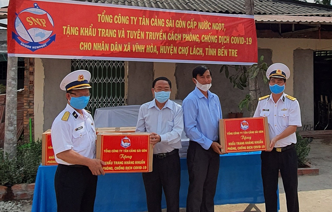 Sáng 31-3, tại bến Vàm Mơn, huyện Chợ Lách, tỉnh Bến Tre, đoàn công tác của Tổng công ty Tân cảng Sài Gòn do Đại tá Phạm Văn Phèn, Phó Tổng giám đốc Công ty làm trưởng đoàn đã phối với UBMTTQ Việt Nam tỉnh Bến Tre và chính quyền địa phương tổ chức cấp nước ngọt, tặng khẩu trang và tuyên truyền cách phòng, chống dịch Covid-19 cho nhân dân xã Vĩnh Hòa, huyện Chợ Lách, tỉnh Bến Tre.