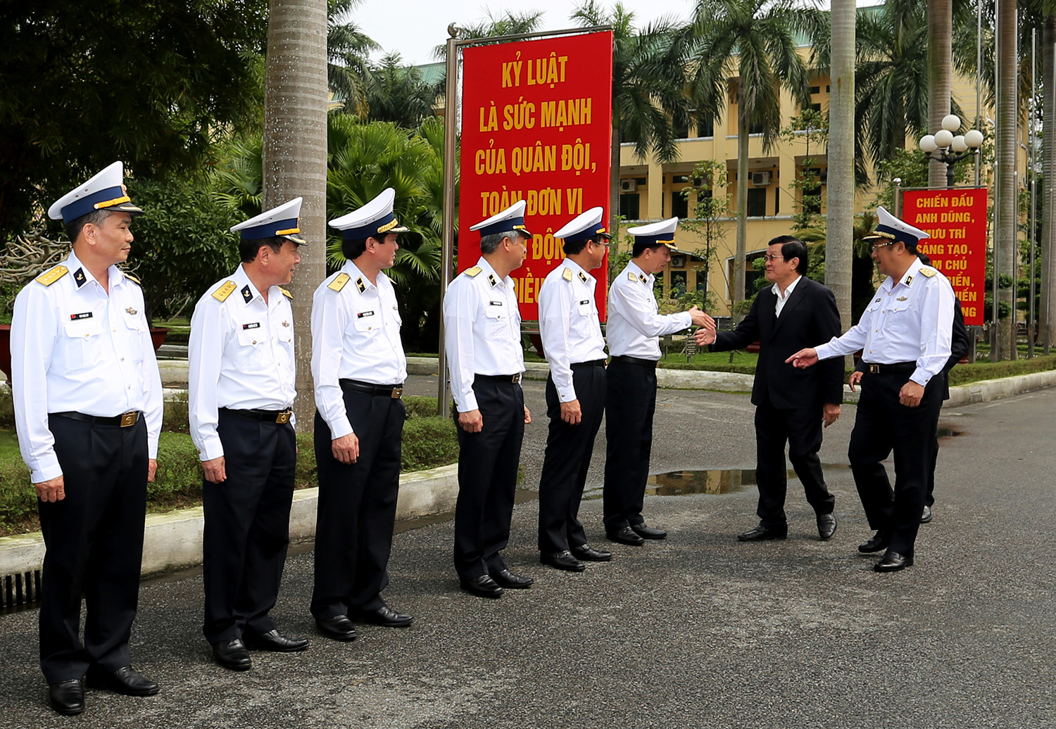 Nguyên Chủ tịch nước Trương Tấn Sang ghi nhận và biểu dương những kết quả đã đạt được trong thời gian qua của cán bộ, chiến sĩ Hải quân đồng thời bày tỏ niềm tin vào bản lĩnh chính trị và tinh thần chiến đấu bảo vệ chủ quyền Tổ quốc của cán bộ, chiến sĩ Hải quân. Nguyên Chủ tịch nước ân cần căn dặn các cán bộ, chiến sĩ Quân chủng Hải quân cần phát huy những kết quả đã đạt được, không ngừng học hỏi để làm chủ và sử dụng thành thạo các loại vũ khí, trang bị kỹ thuật hiện có và mới; tiếp tục khẳng định vị trí là lực lượng nòng cốt trong bảo vệ vững chắc chủ quyền biển, đảo của Tổ quốc.