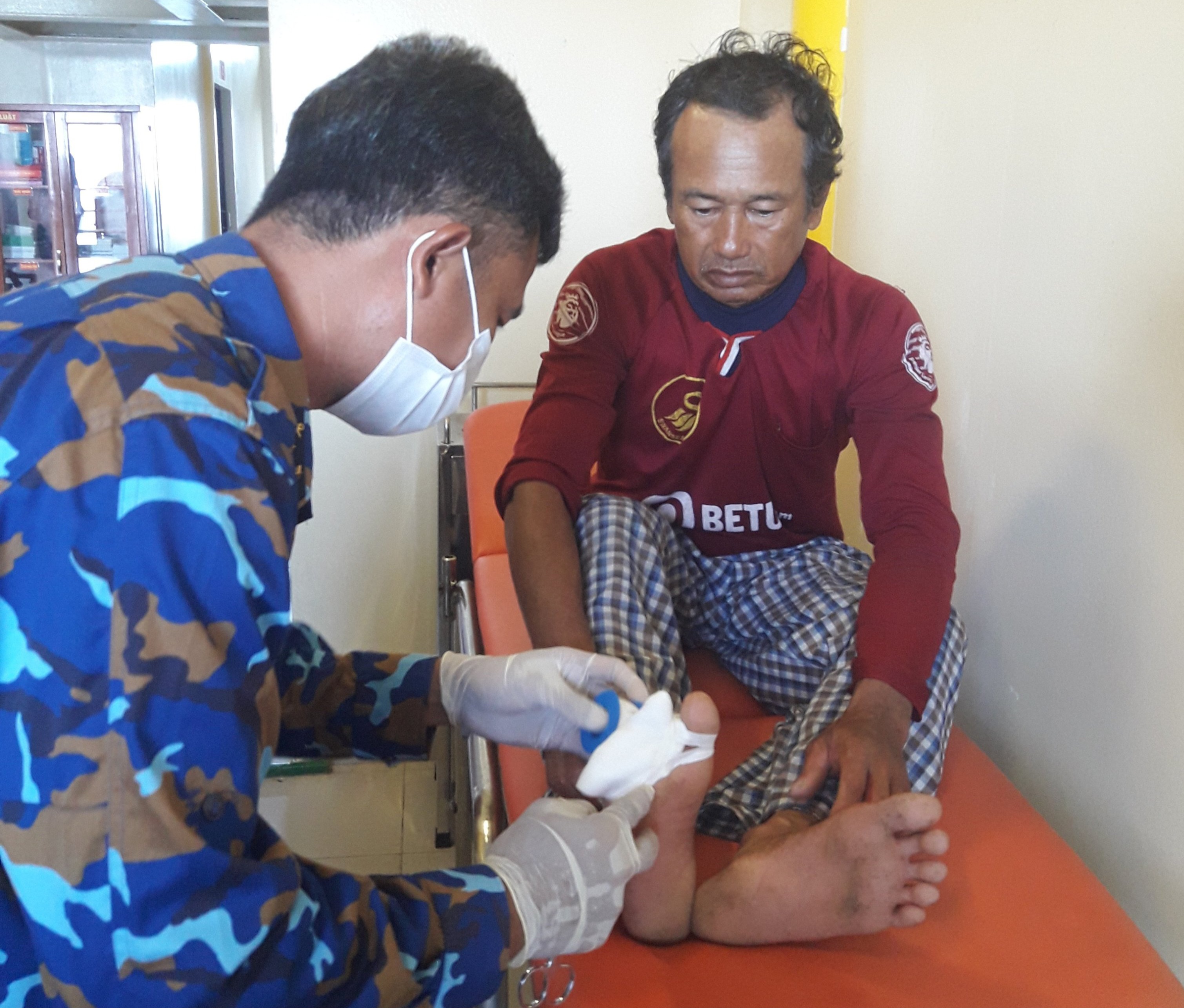 Cán bộ, nhân viên Nhà giàn DK1/9 đã tiếp nhận và đưa ngư dân lên phòng y tế của Nhà giàn, tiến hành sơ cứu, vệ sinh sát trùng, kháng khuẩn và băng cầm máu, cho uống thuốc giảm đau, kháng sinh.