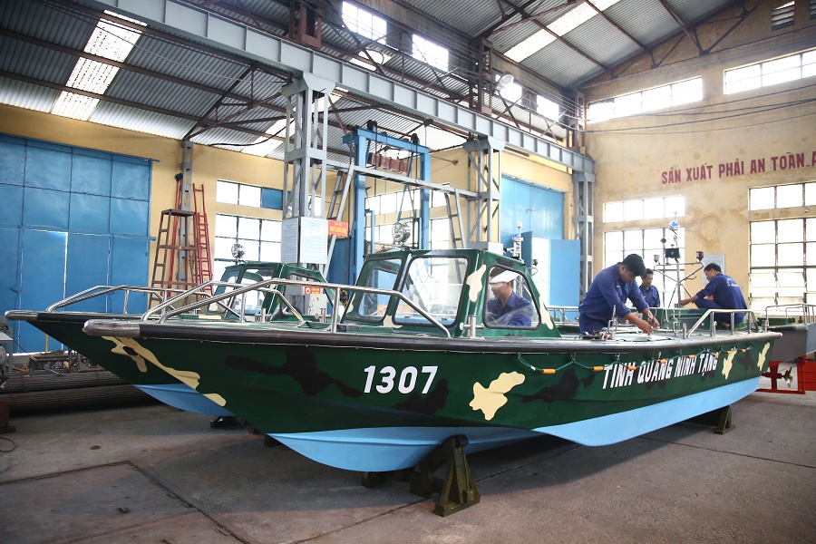 Cán bộ, nhân viên Nhà máy đang hoàn thiện chiếc Xuồng CQ-01 số hiệu 1309 của tỉnh Quảng Ninh tặng quân dân, huyện đảo Trường Sa