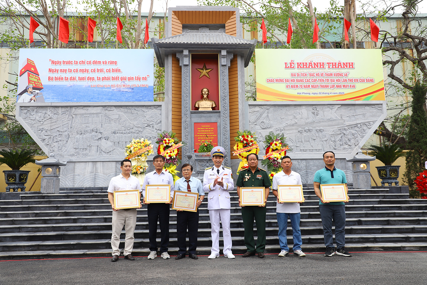 Thừa ủy quyền của thủ trưởng Bộ Tư lệnh Hải quân, Thượng tá Phạm Văn Trà trao Bằng khen tặng các tập thể, cá nhân, doanh nghiệp có thành tích tốt trong xây dựng Bia di tích “Bác Hồ về thăm Xưởng 46”